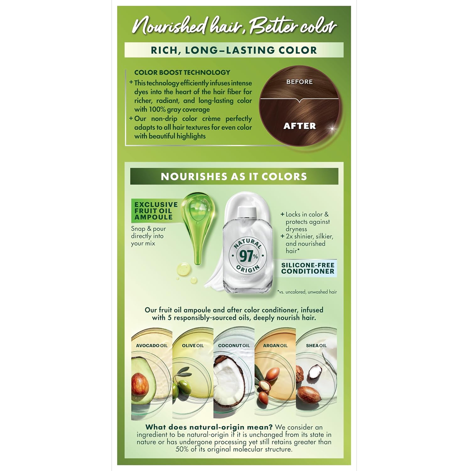 - Hair Dye Kit: The only hair color with a separate fruit oil ampoule that you snap & pour directly into the mix; Follow hair dye with our after color hair conditioner, infused with a blend of 5 fruit oils: avocado, olive, shea, argan & coconut oil