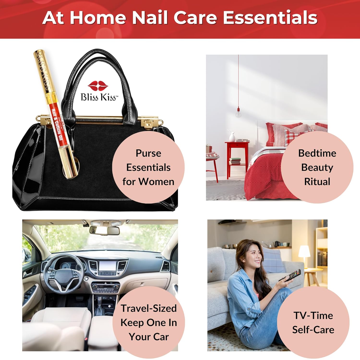 - Broken Nails That Refuse to Grow? Aren’t you tired of wishing you were born different? Most people think that “harder” nails will help them grow longer. Using a nail strengthener or hardener actually makes nails too hard, more brittle, and more prone to breaking. Longer nails flex when you bump them into things. Strong flexibility comes with using a high-quality nail oil blend. Bliss Kiss nail and cuticle oil pens are the best portable nail repair solution for broken nails that just won’t grow.