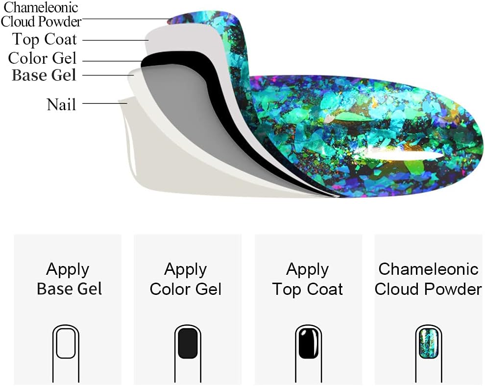 - MULTIPLE EFFECTS - Apply it on black base gel and white base gel will get different chameleon effect.It made of 100% pure synthetic resin powder, non-toxic, long-lasting. Smooth and non-grainy texture.