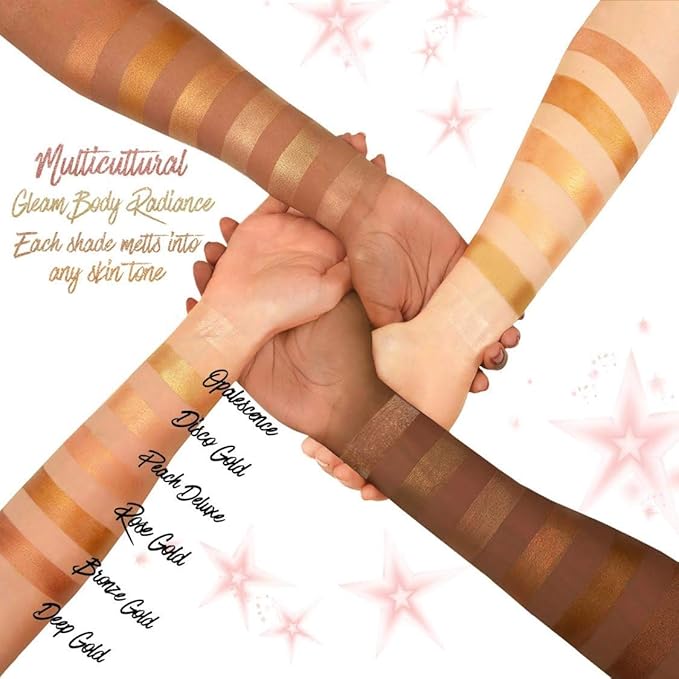 - Opalescence: Opalescence is a universal shade with soft pink iridescent undertones. The sheer white moisturizer is the perfect all over glow for face and body on all skin tones without adding any color. Use as a primer for face & highlighter or all over body for perfected glowing skin. Gleam’s lightweight moisturizing makeup will help diminish minor imperfections while hydrating skin and improving skin appearance.