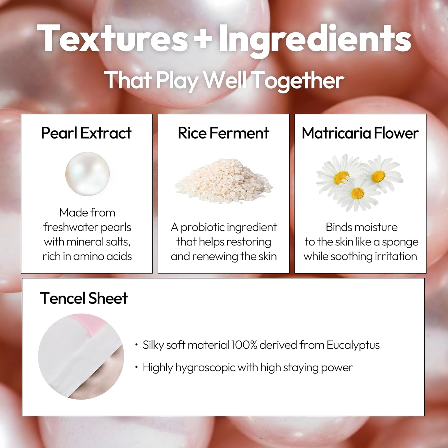- CLEAR SKIN - Our Pearl mask, a tencel sheet mask with Pearl extract, contains anti-aging benefits to promote rejuvenation and help your skin emulate the soft, classic beauty of the gemstone.