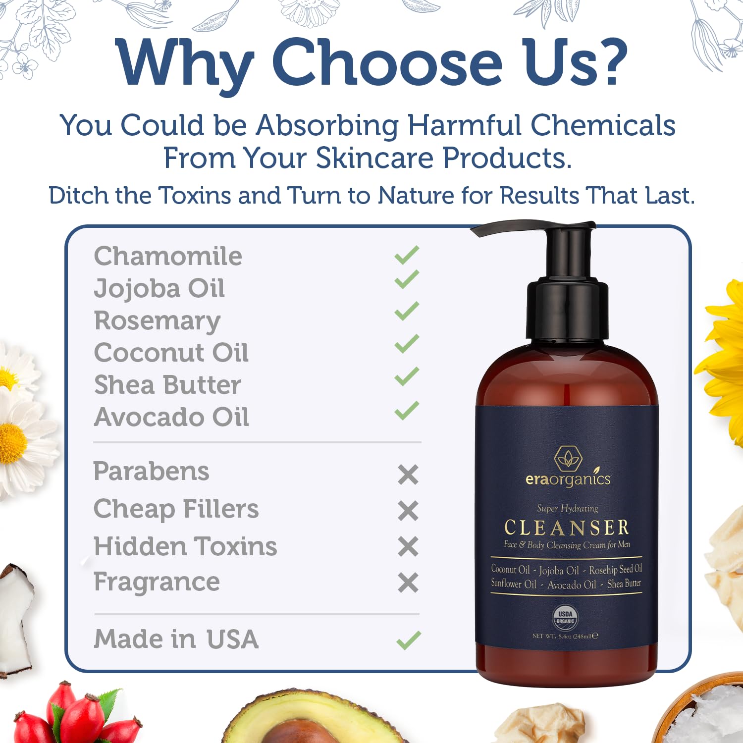 Era Organics USDA Organic Men's Face Wash - Nourishing, Hydrating Facial, Body Cleanser for Smoother Skin