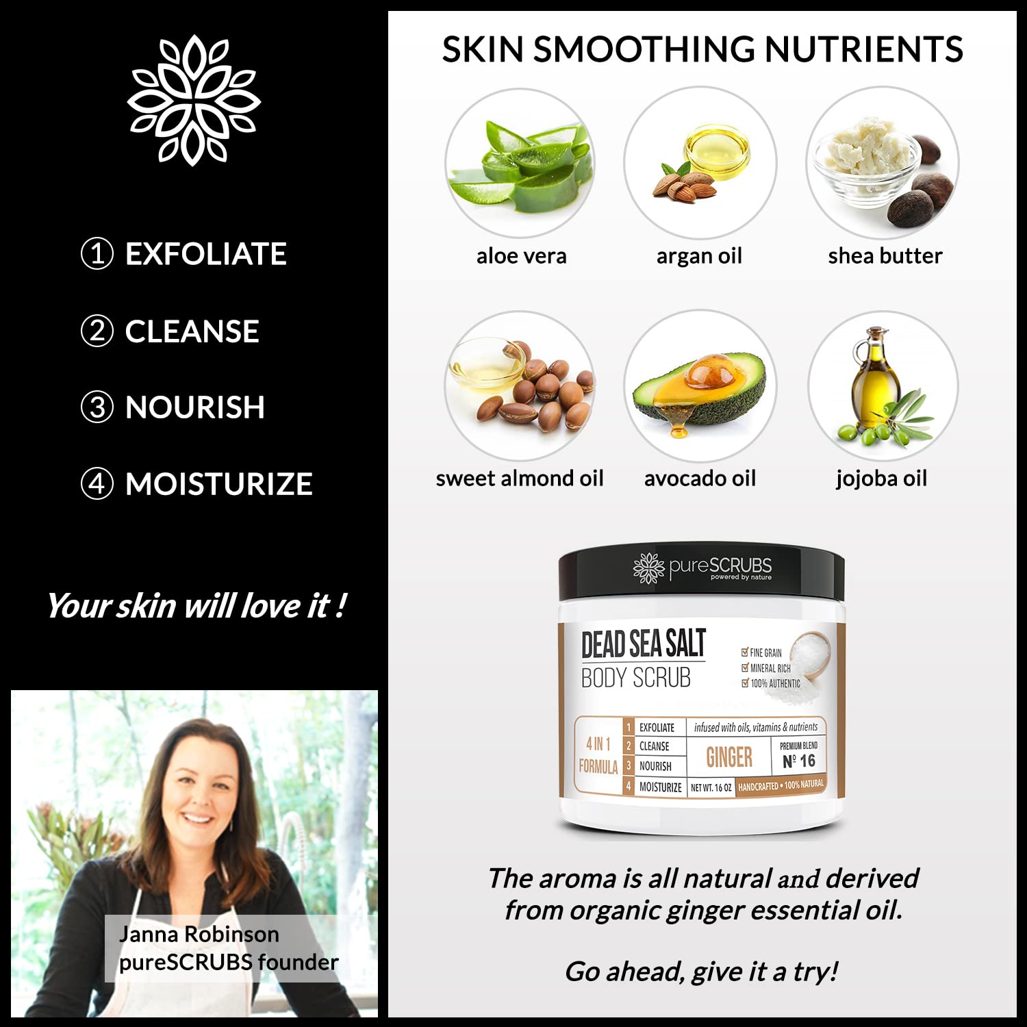 - GET ULTRA SMOOTH SKIN FAST - THIS WORKS! Our unique “4 in 1 Formula” does everything a body scrub should do and more - EXFOLIATE, CLEANSE, NOURISH & MOISTURIZE. Fine grain dead sea salt infused with essential oils, nutrients and skin softeners helps to smooth away rough, bumpy, and uneven textures to instantly reveal your true soft, healthy and radiant skin. You'll love the vanilla aroma!