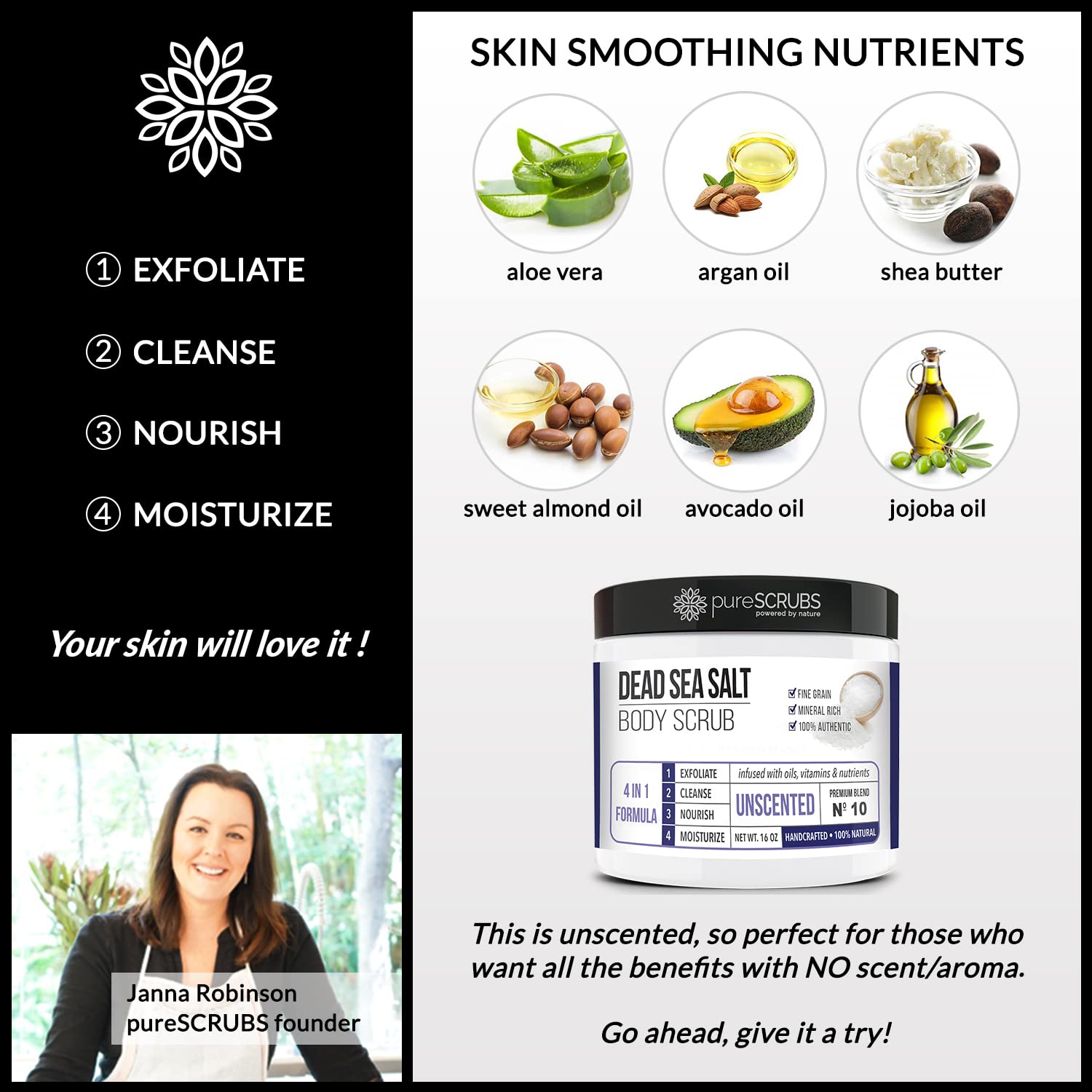 - GET ULTRA SMOOTH SKIN FAST - THIS WORKS! Our unique “4 in 1 Formula” does everything a body scrub should do and more - EXFOLIATE, CLEANSE, NOURISH & MOISTURIZE. Fine grain dead sea salt infused with essential oils, nutrients and skin softeners helps to smooth away rough, bumpy, and uneven textures to instantly reveal your true soft, healthy and radiant skin.