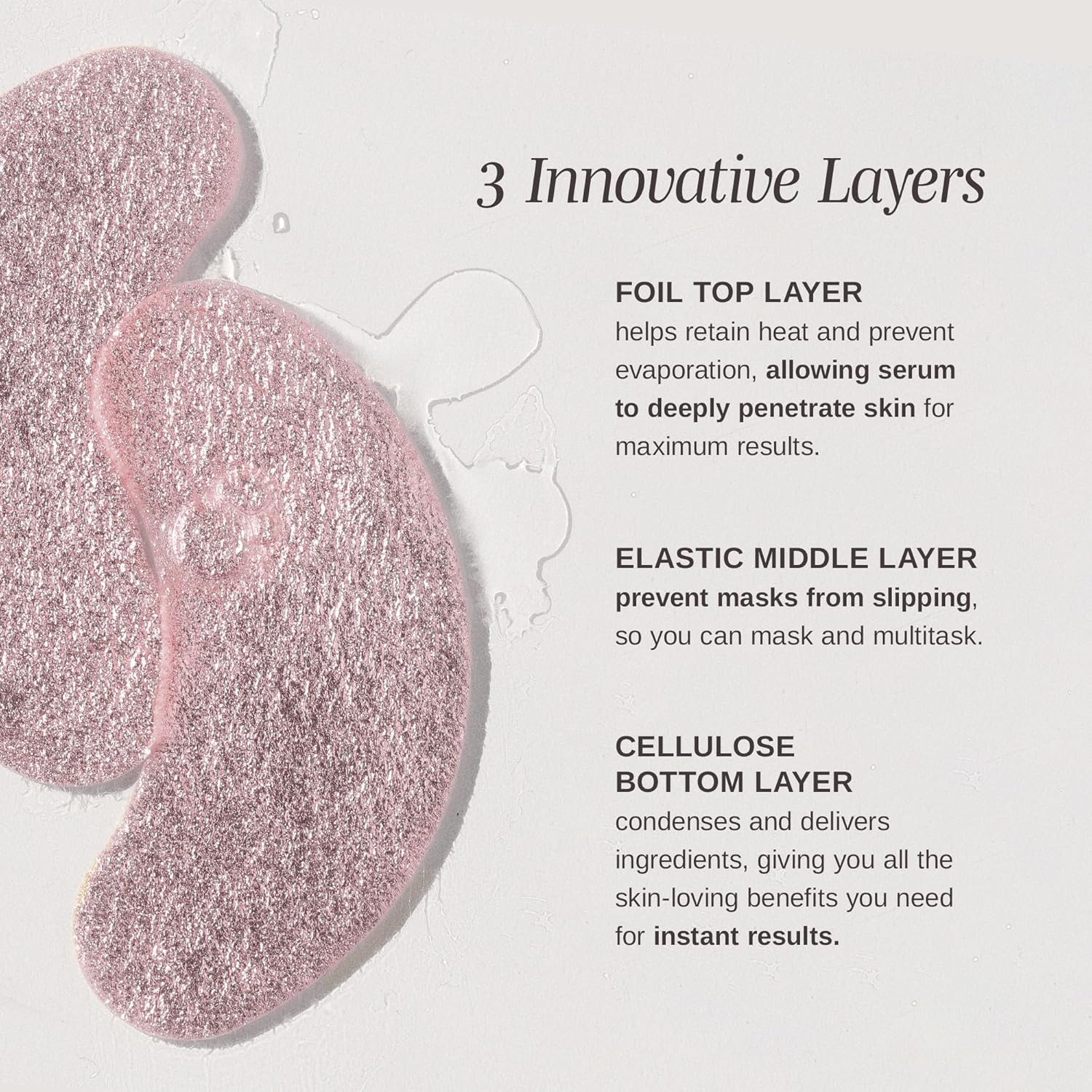 - Multi-Layer Absorption Technology - The top layer of foil helps prevent evaporation, allowing the serum to deeply penetrate the skin. Its elastic middle layer prevents the eye mask patches from slipping, while the bottom layer of cellulose fiber delivers key ingredients to the delicate under eye area to deliver maximum skin-loving benefits and a smooth skin texture.
