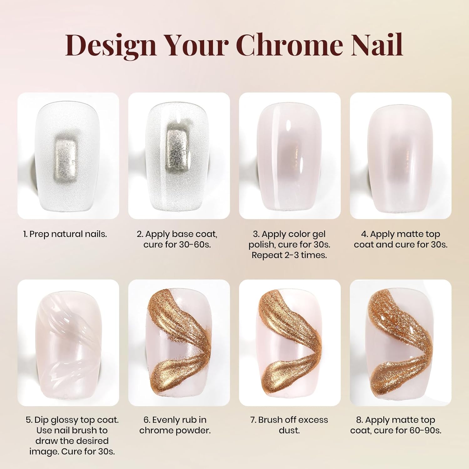 - Design Your Chrome Nail:1. Prep natural nails.2. Apply base coat, cure for 30-60s.3. Apply colorgel polish, cure for 30s. Repeat 2-3 times.4. Apply matte top coat and cure for 30s.5. Dip glossy topcoat. Use nail brush to draw the desired image. Cure for 30s. 6. Evenly rub in chrome powder.7. Brush off excess dust.8. Apply matte top coat, cure for 60-90s.