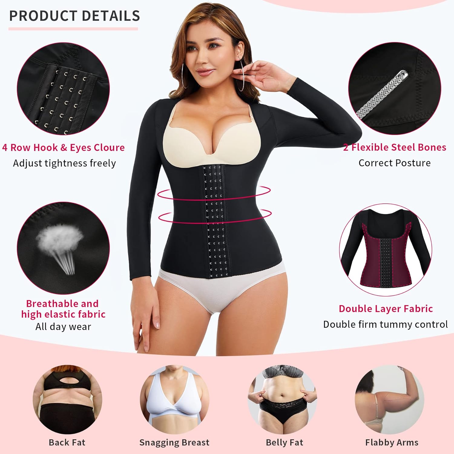 - Fabric type : For the best size shapewear tops, please measure your waist then refer to our shapewear size chart. If your size is in between, you can choose a size up.