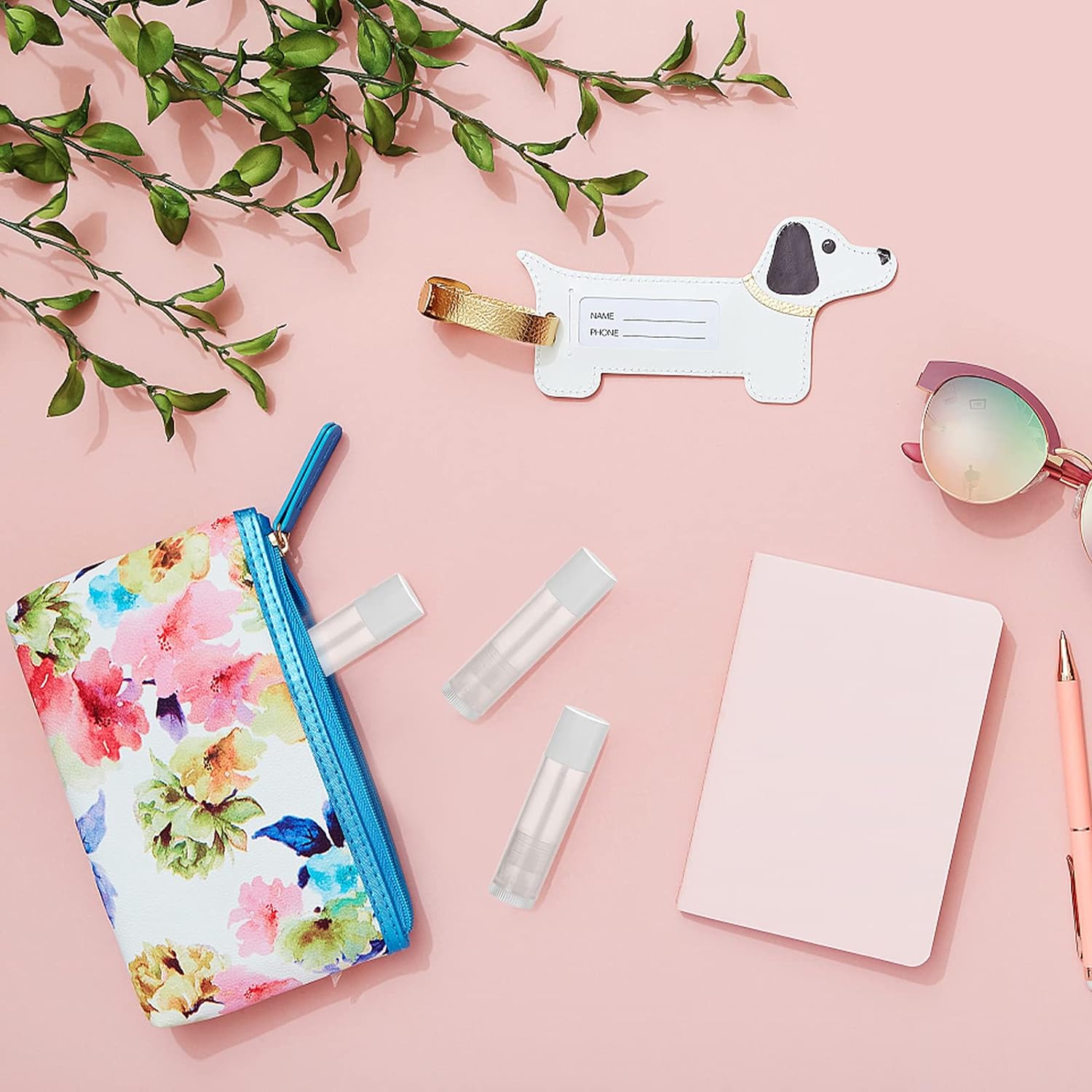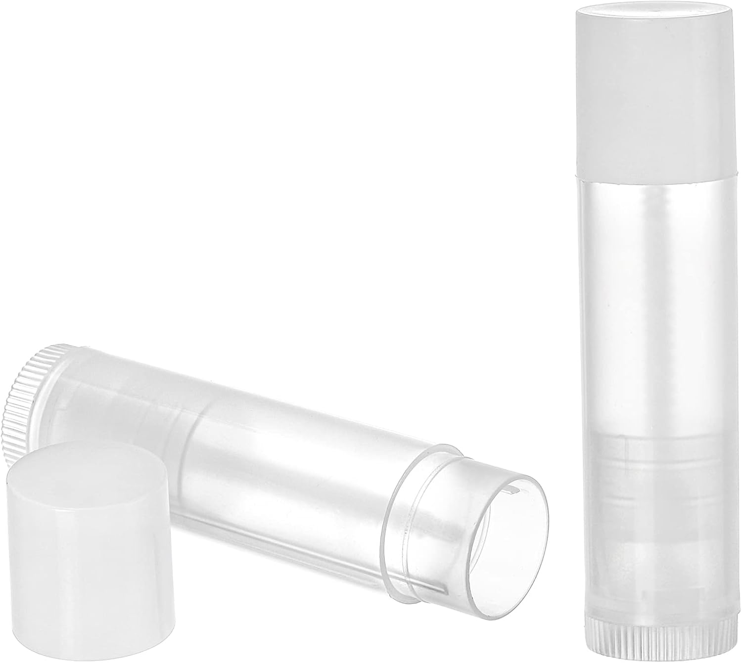 - Bekith 100 pack 5.5ml empty lip balm tubes with white snap-on caps.