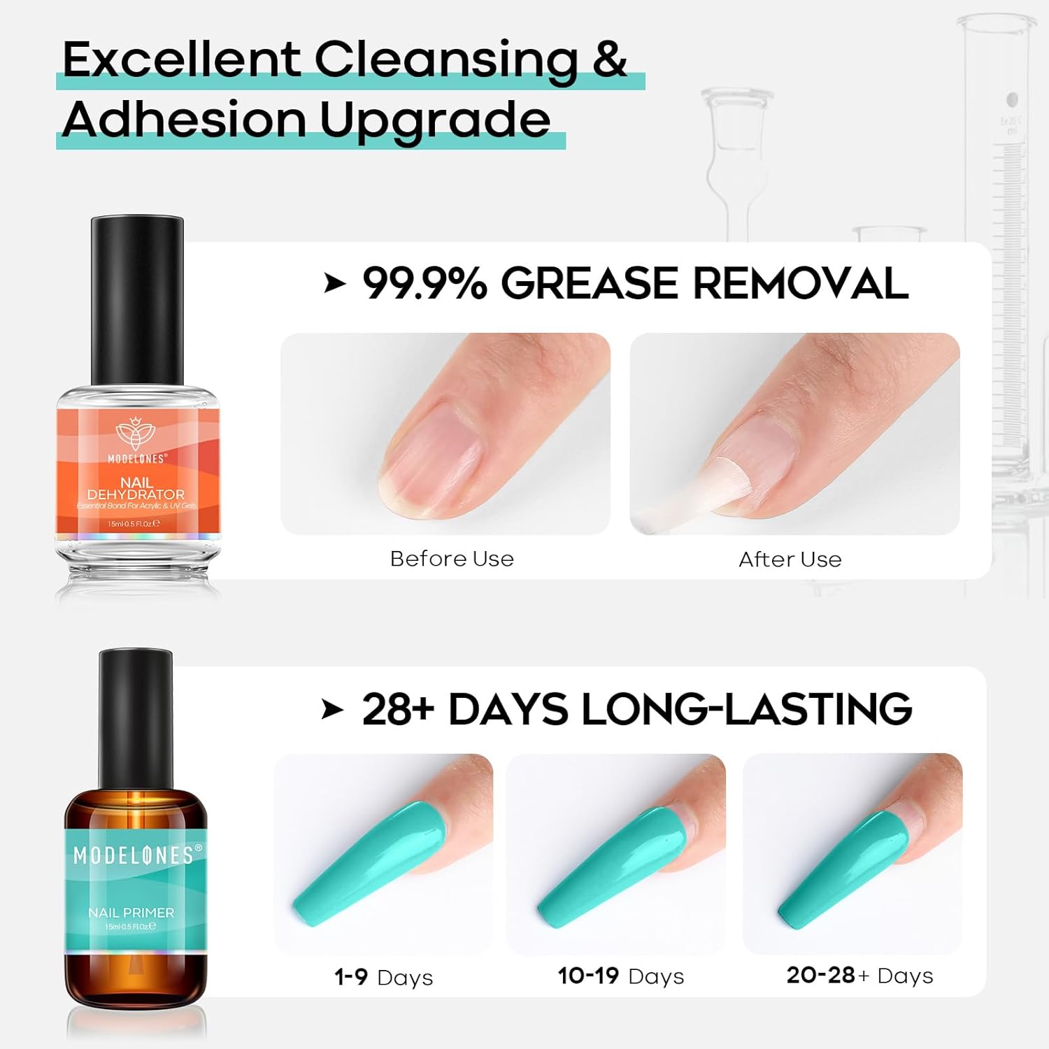 - The basis and must-have of nail art: To create a foundation, using this nail prep kit to prepare the nail plate is the most crucial step in any professional manicure! The dehydrator nail prep can clean the nail surface and helps to bond the natural nails and mani products. The gel nail polish primer can enhance the stickiness of the nail surface, and help the mani products not lift and be long-lasting for more than 28 days.