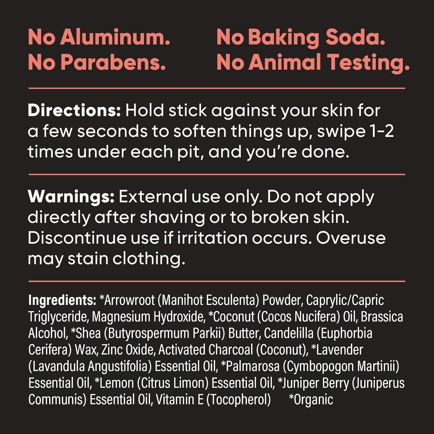 - EFFECTIVE ODOR CONTROL - Specially made for those with sensitive skin, our baking soda-free deodorant uses activated charcoal, zinc and magnesium to fight odor naturally. Organic arrowroot powder absorbs moisture so you stay dry and fresh. Get powerful all-day odor protection without aluminum.