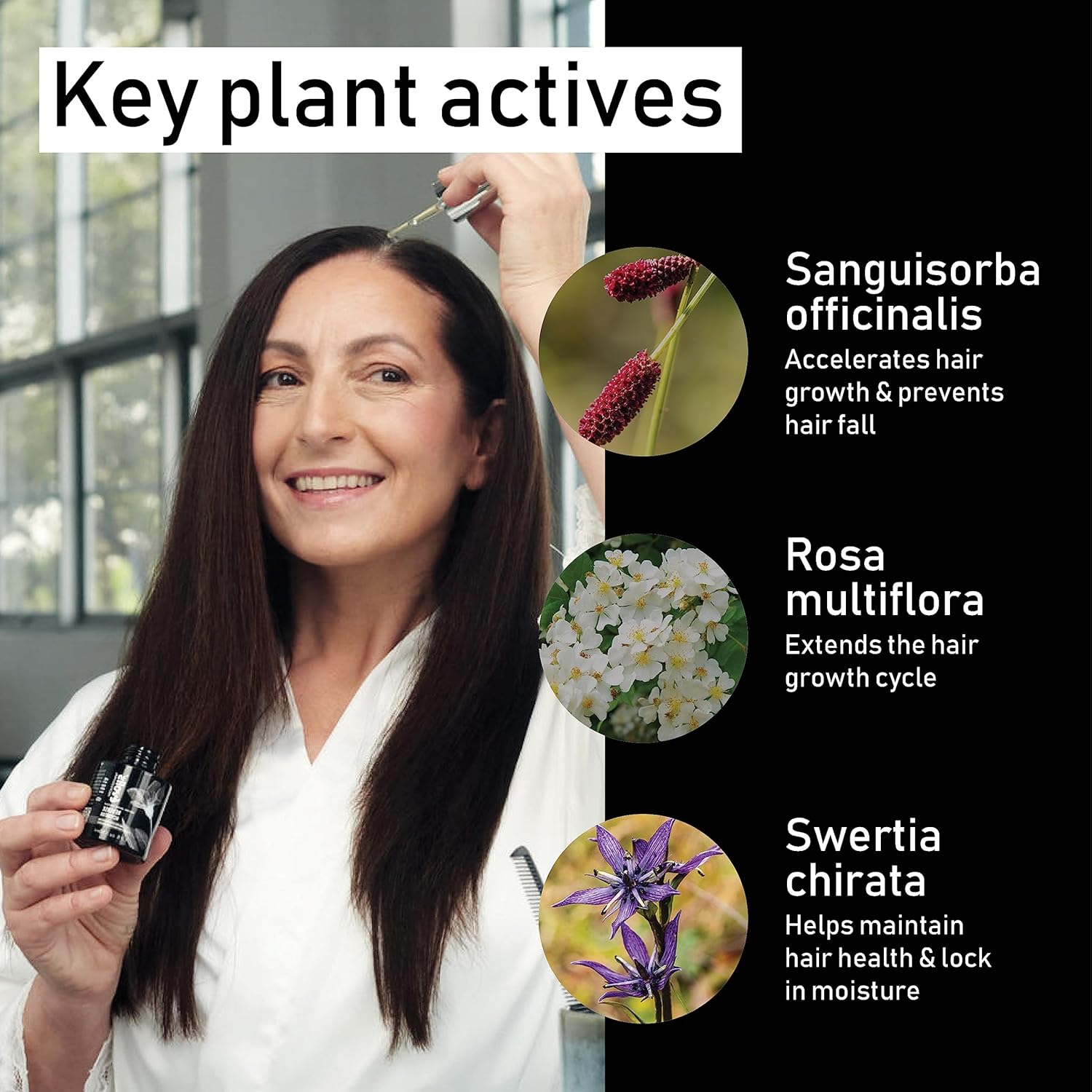- Proprietary Blend of Scalp-Nourishing Actives – A powerful scalp treatment infused with a blend of antioxidants, natural hair thickening products, and FGF5 blocking botanicals, a key protein responsible for hair loss, to extend the hair’s natural growth cycle. The self-dosing pipette ensures precise application, delivering the right amount of product for optimal scalp and strand care.