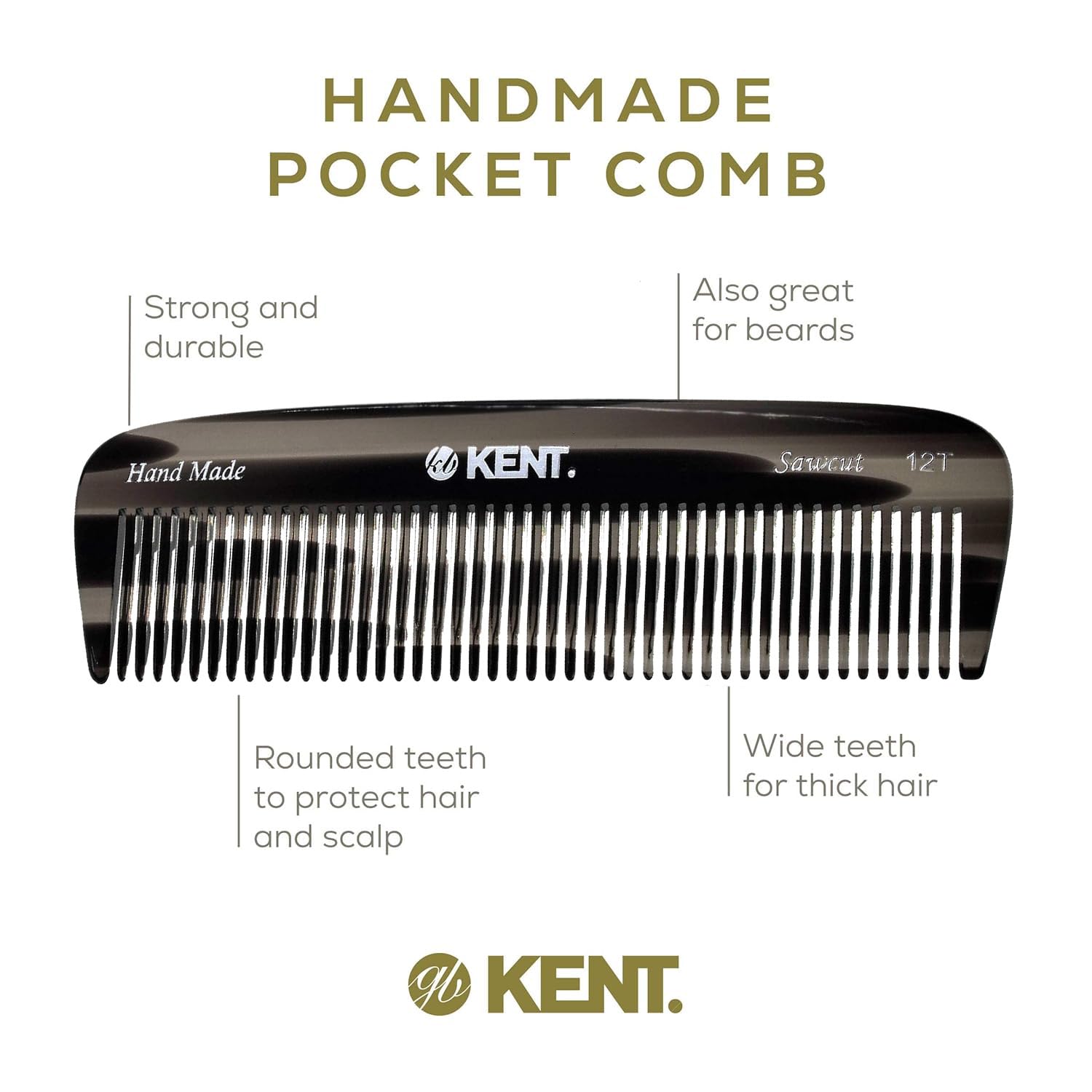 Kent 12T Black Graphite Pocket Comb - Handmade Wide Tooth Hair Comb for Men, Women, and Kids - Travel, Beard, and Mustache Comb - Saw Cut and Hand Polished Made in England