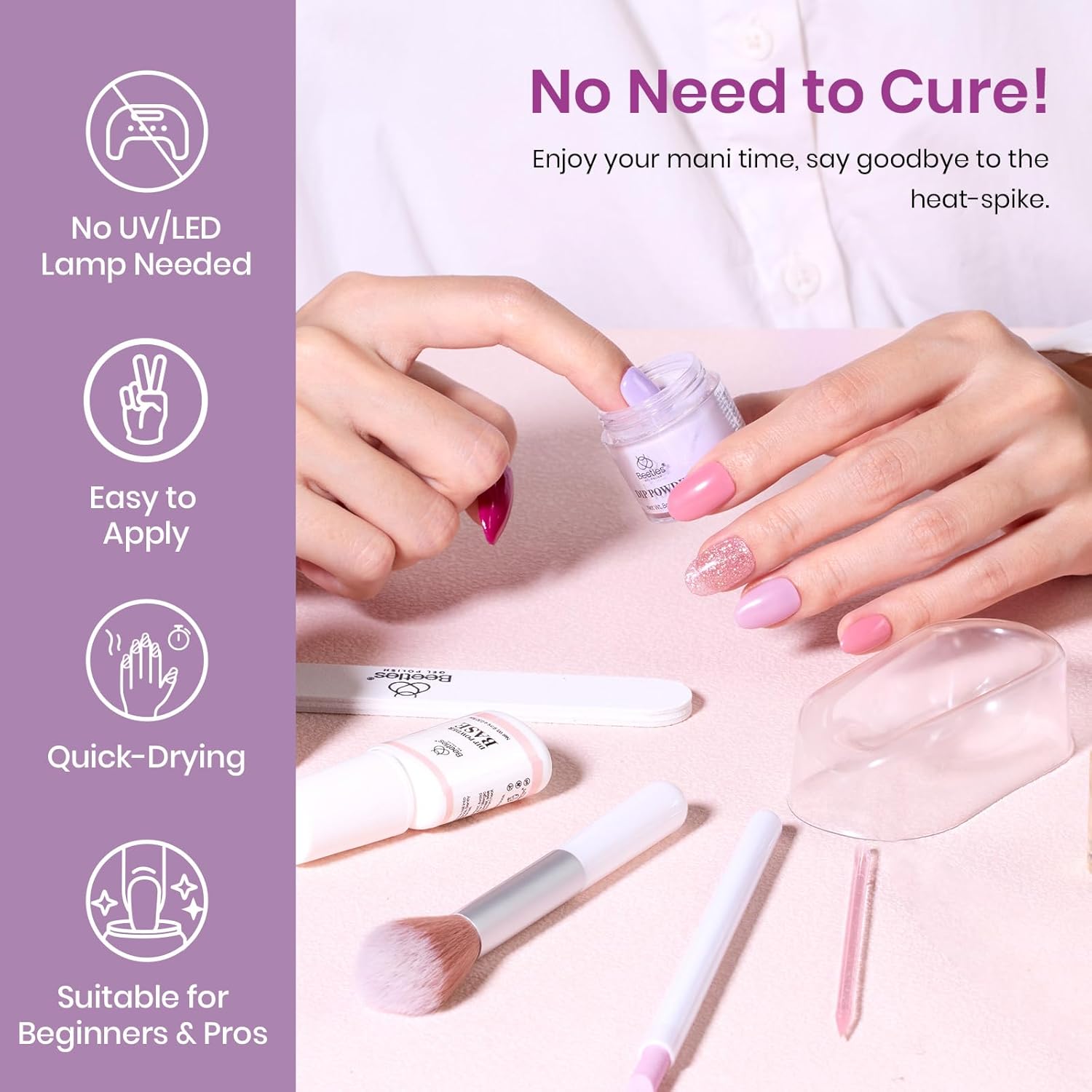 - Safe and No Need Curing: Compared to traditional nail lacquer, gel polish, and traditional acrylic systems, the dip nails powder starter kit doesn't need a UV light to cure, which is better for your skin and nails. The dip powder is low odor, would not damage your nail bed, and is available for air dry. It's safe and easy to handle for both professionals and home users.
