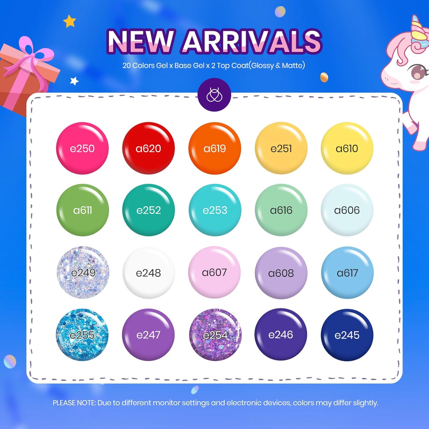 - WHAT YOU GET: Upgraded Beetles Rainbow nail color trends in 2024, 20 X Mini Gel Colors (5ml./each bottle) + 3 x No Wipe Base and Glossy & Matte Top Coat ( 7.5ml./ each bottle)+1 x Double-ended Brush.Color Number is: e250-a620-a619-e251-a610-a611-e252-e253-a616-a606-e249-e248-a607-a608-a617-e255-e247-e254-e246-e245.