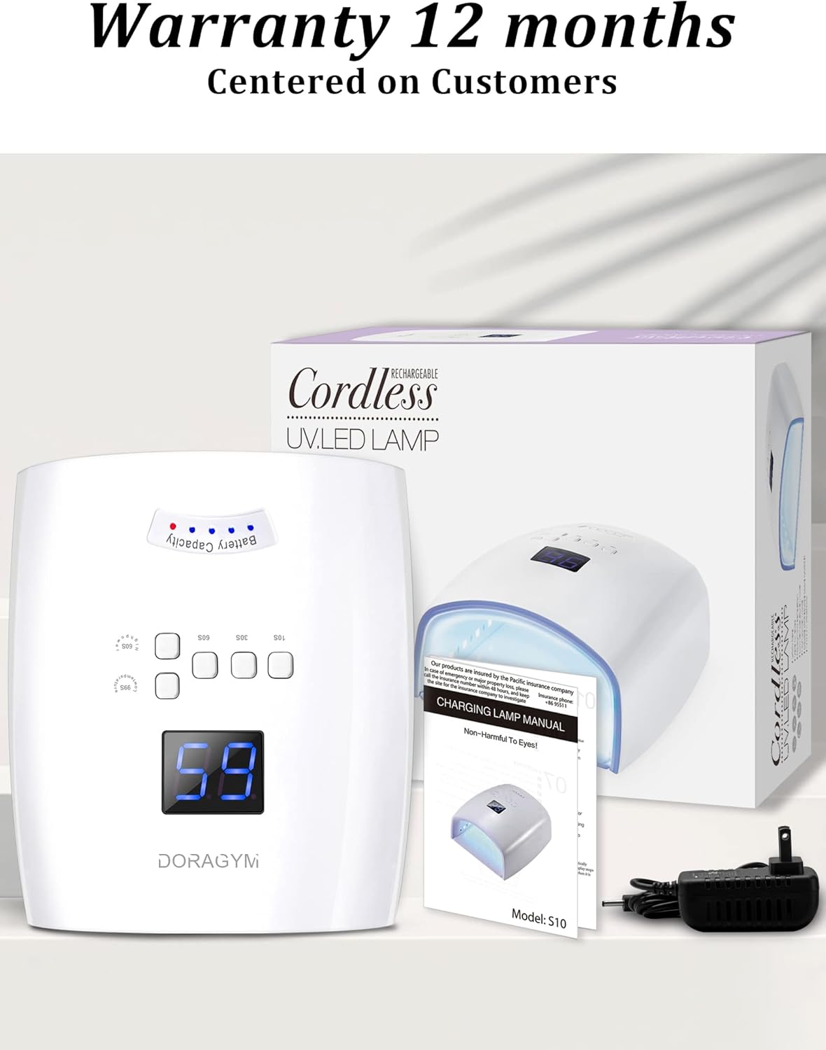 - 【Rechargeable Cordless Design】This cordless nail lamp adopts portable design, with 7800mAH lithium battery, uv light for gel nails can work continuously for 240Min after 3 hours of charging and be carried without an extension cord. Say goodbye to the need for a power outlet and great for nail salons on the go