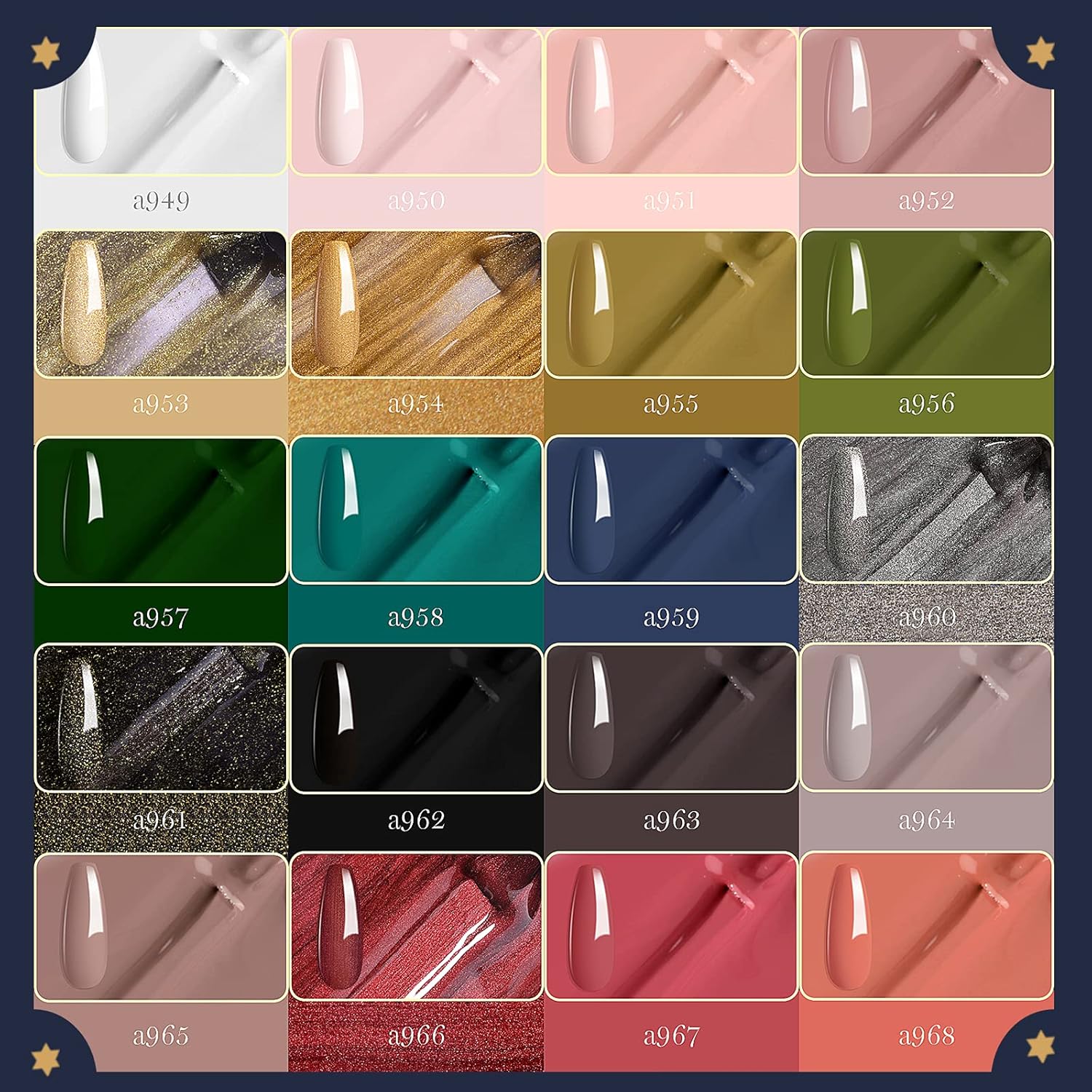 - WHAT YOU GET: 20 x Mini Gel Polish Colors (5ml each bottle) + 3 x No Wipe Base and Glossy and Matte Top Coat (7.5ml each bottle). Beetles noble nude grey glitter Gel Nail Polish Set with 20 beautiful shades of popular and trendy colors is suitable for winter seasons and daily routine life! Perfect gift for nail lovers.