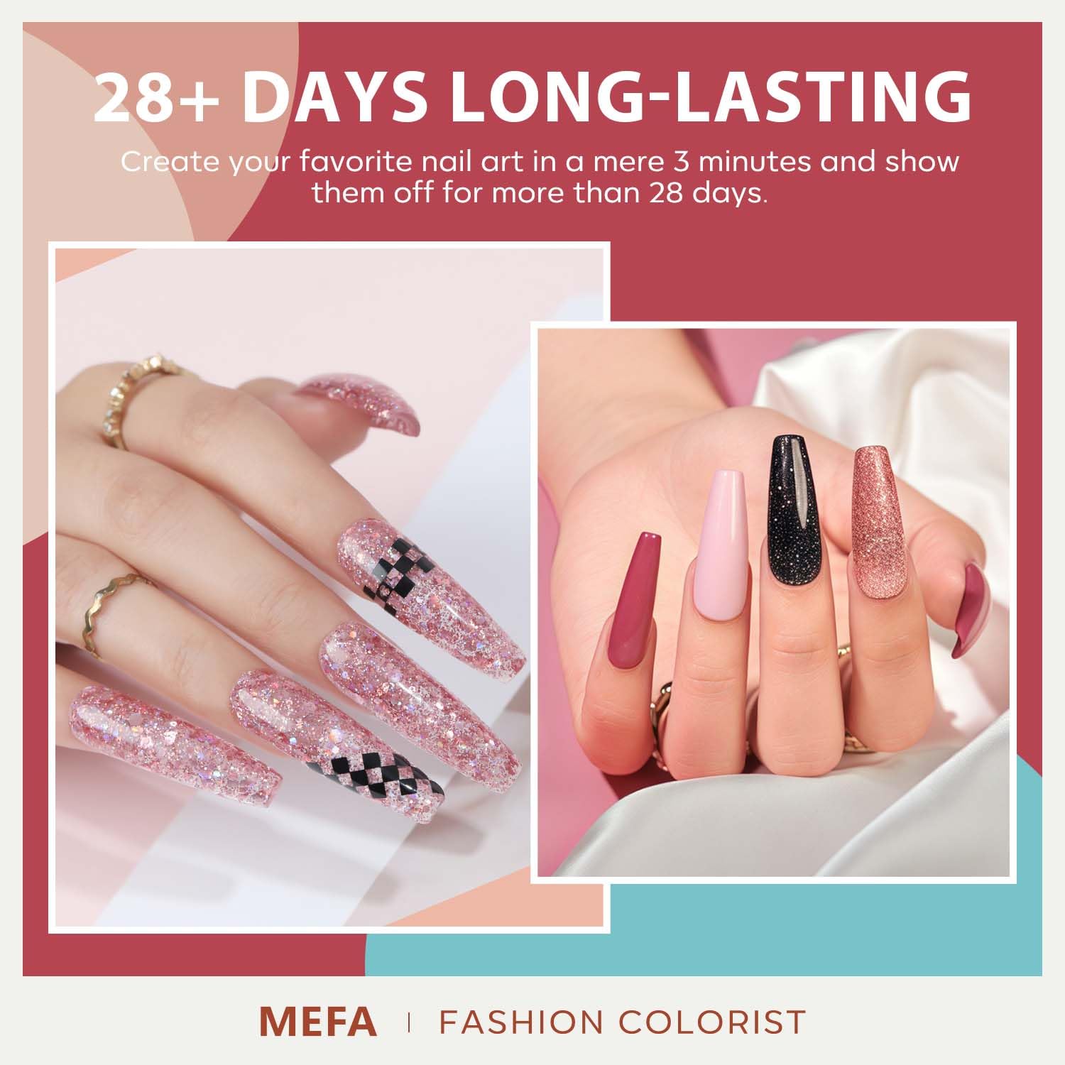 - Long Lasting 28 Days+: This nail polish easy to apply, you can get salon nail art in 3 minutes. The gel polish application is smooth, bubble-free. It takes 60-90s to cure under the MEFA nail lamp, you can achieve 28 days of color stay perfect