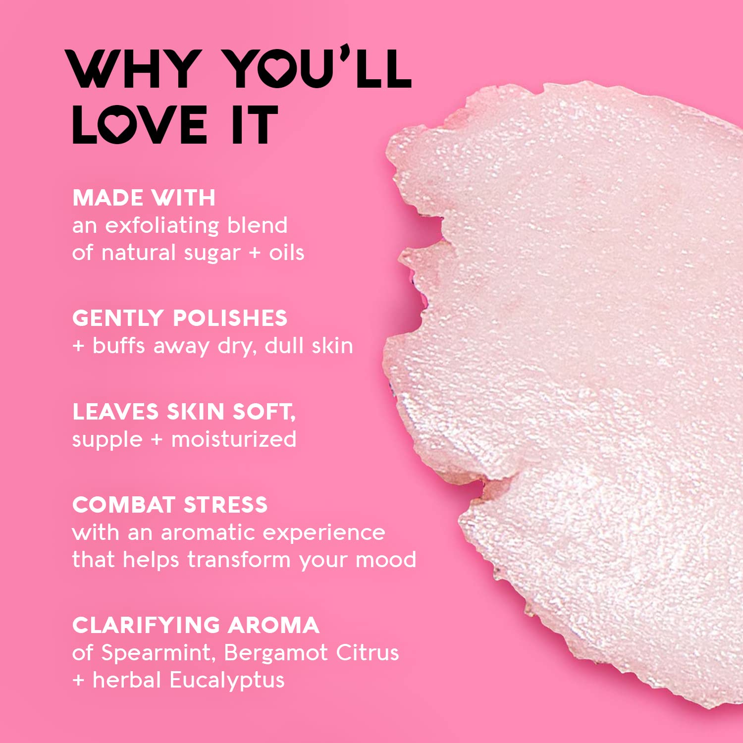 - Gently Exfoliate: Sugar-based scrub buffs away dry skin; ideal for rough areas like elbows and heels