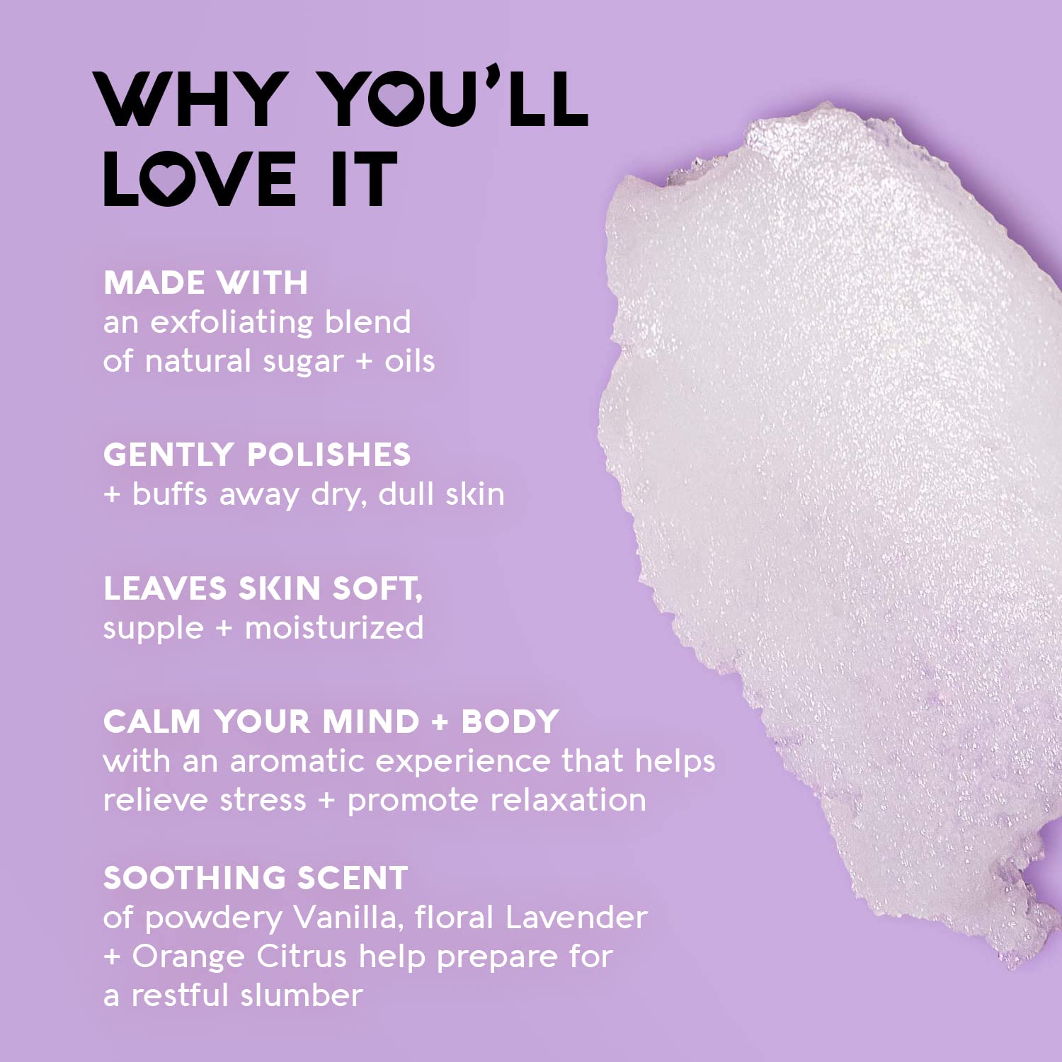 - Gently Exfoliate: Sugar scrub buffs away dry, dead skin for a smooth and refreshed feel