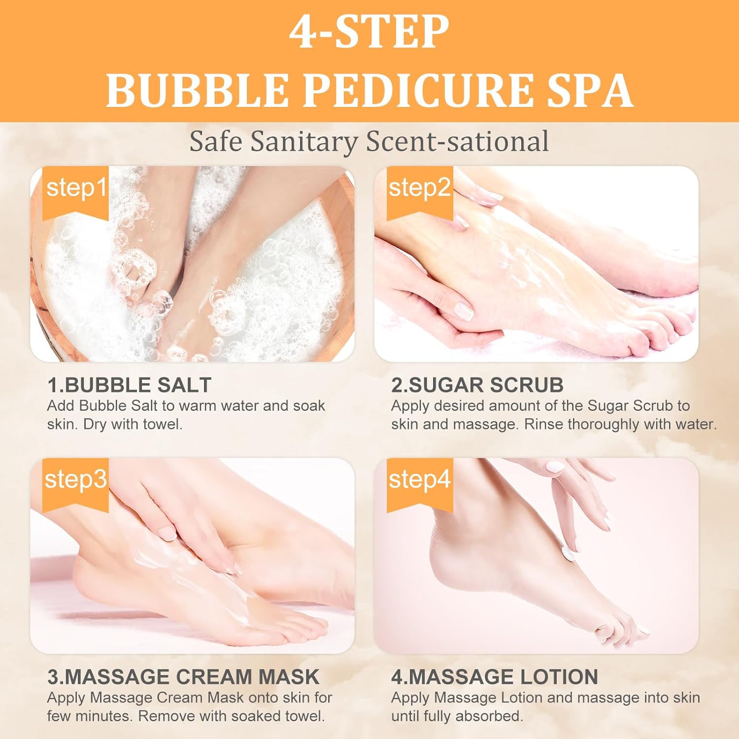 - 🍅[Individually Packaged Foot Spa] This foot soak is individually packaged which guarantees a clean and hygienic source to your foot care. There are 4 steps in a pedicure and it's easy to travel with, allowing you to enjoy the spa experience anytime, anywhere.