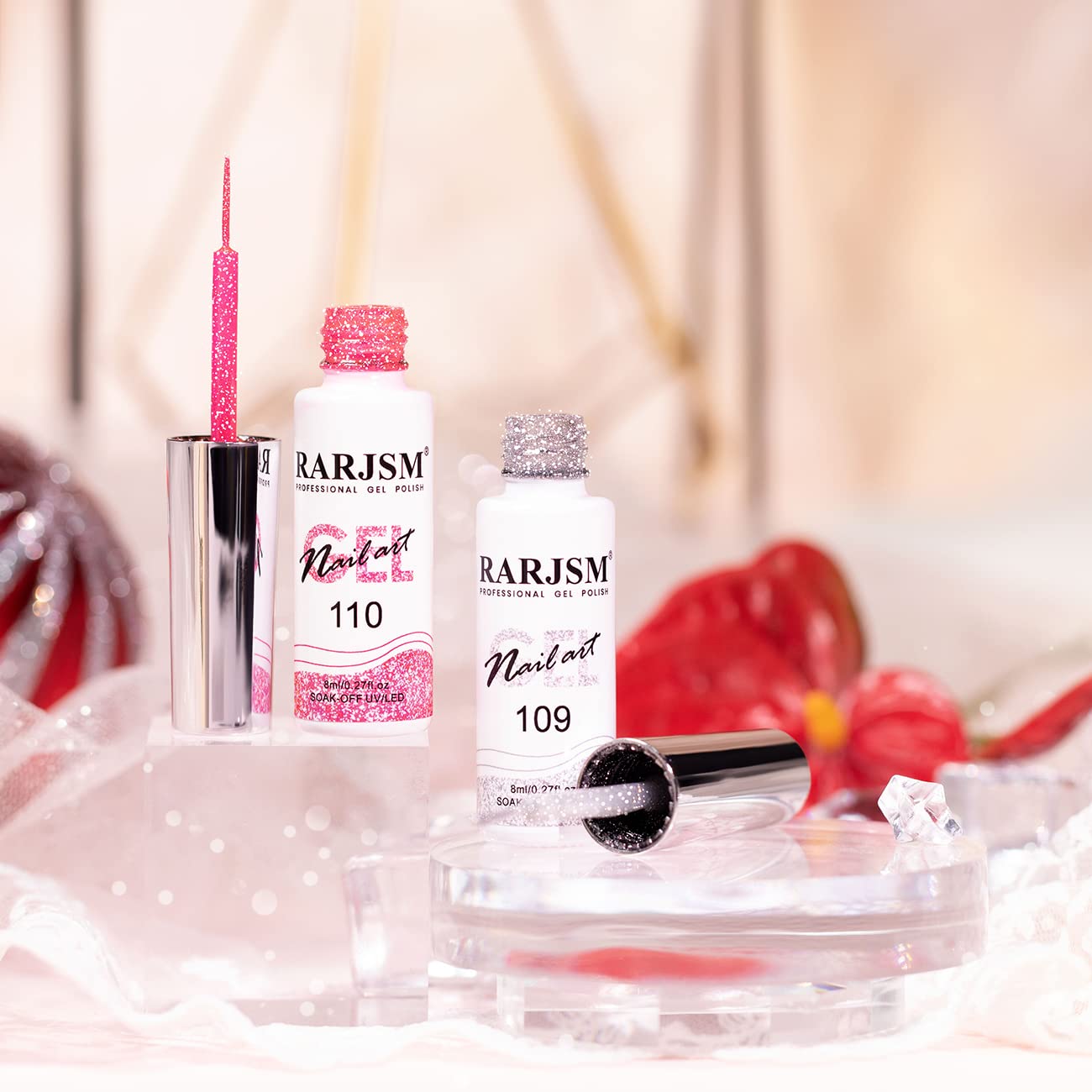 - EXPLOSIVE DIAMOND NAIL ART GEL:Reflective gel nail polish shows normal effect in natural light.When exposed to direct flashlight or sunlight,it flares up with bright lights,creating a stunning effect like diamond nails!The flashing glitter liner gel polish can be used with the color gel of RARJSM nude series, which can create many different kinds of nail art design