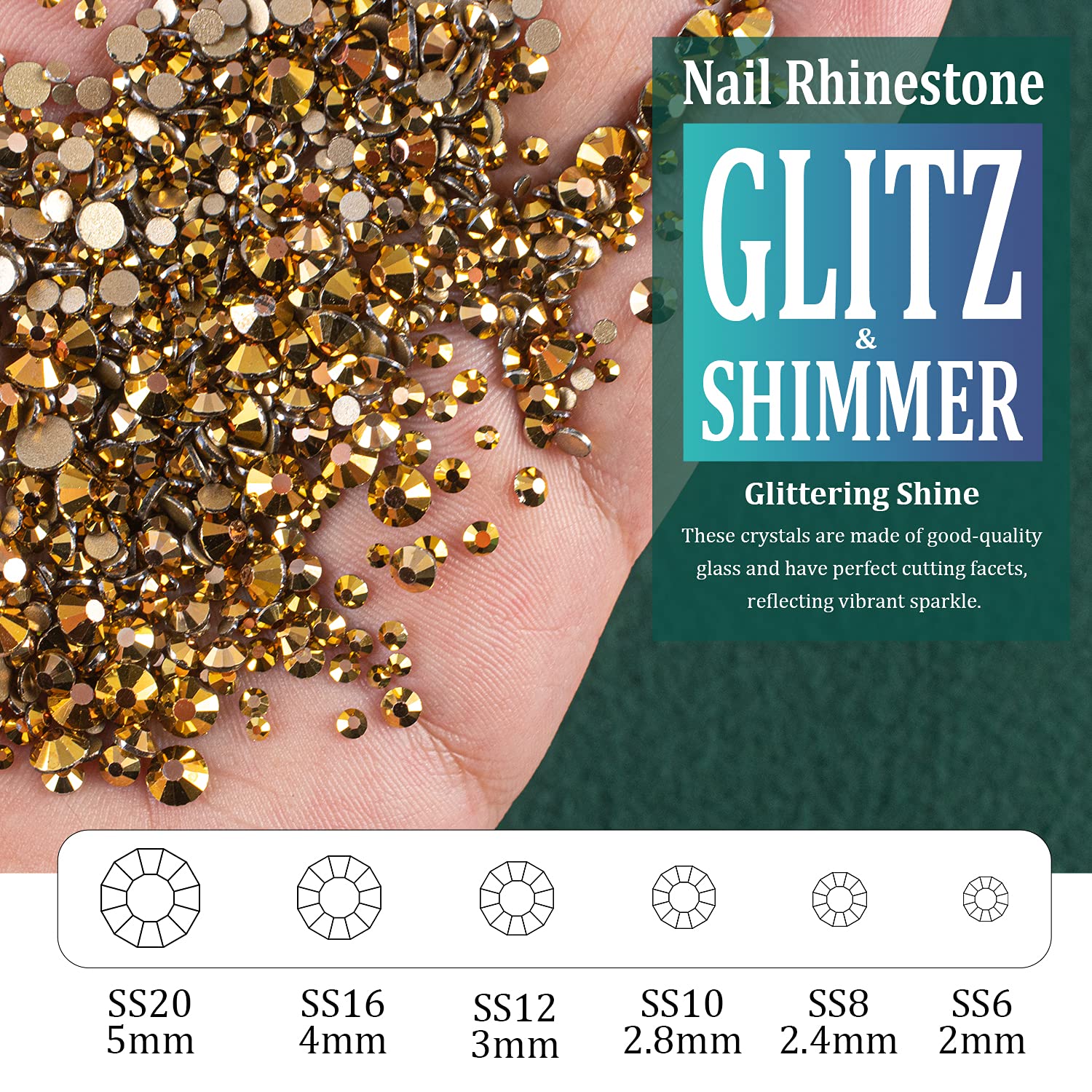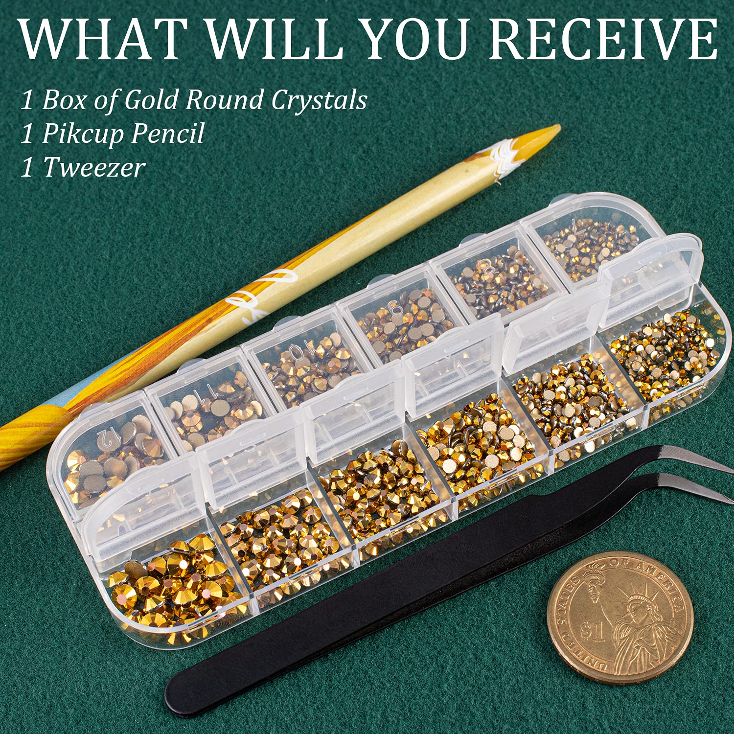 - ❤WHAT YOU WILL RECEIVE -- 1 Box of 6 Sizes Gold Round Glass Nail Crystal Rhinestones Beads (Totally About 1720 PCS); 1 PCS Rhinestone Picker Pencil; 1 PCS Tweezer. The Well Equipped Rhinestone Set Is Suitable for Both Professional Nail Technician and Inexperienced Starter for Nail Art.