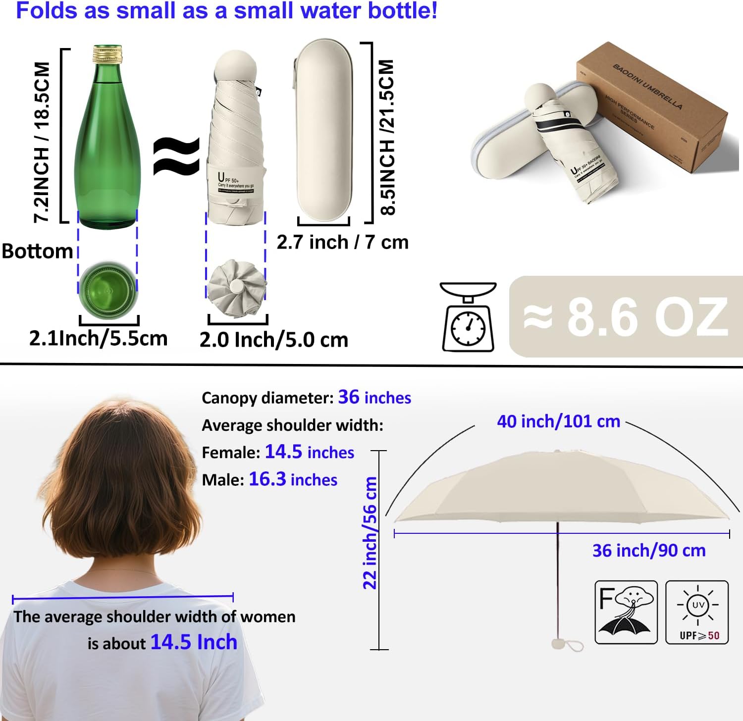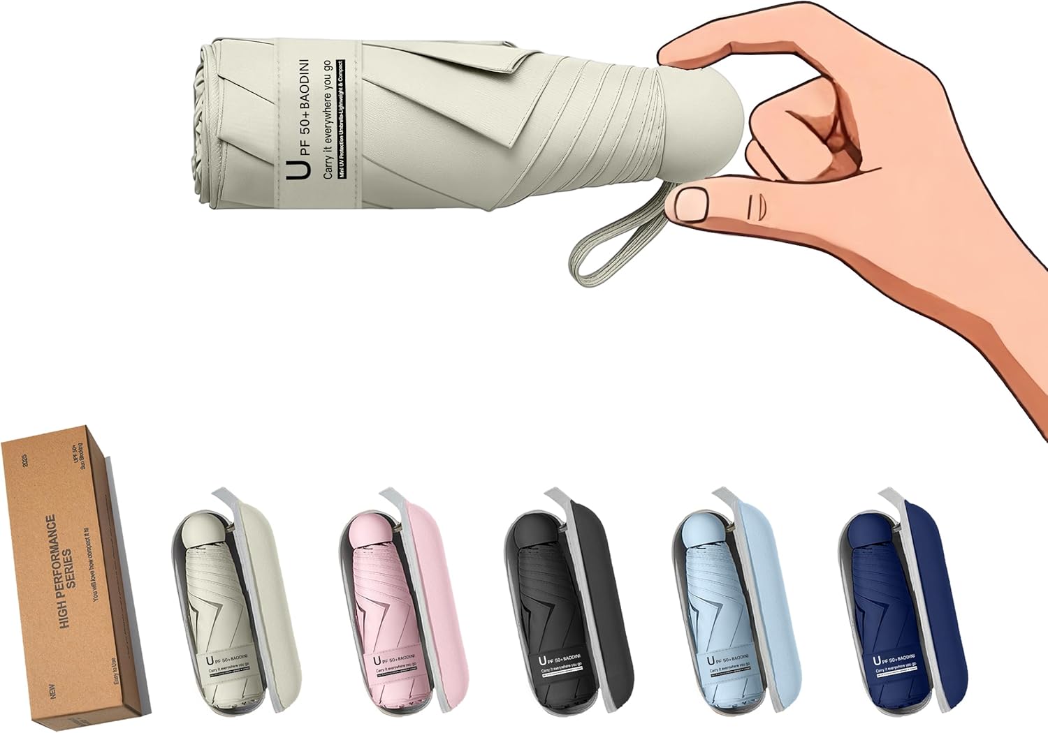 BAODINI Travel Essentials Mini Umbrella for Purse With Case Small Compact UV Sun Protection Lightweight Tiny Pocket Manual Open Close Umbrella for Women Kids and Men Fit Purse Backpack