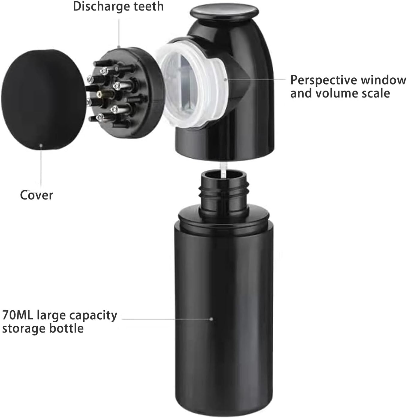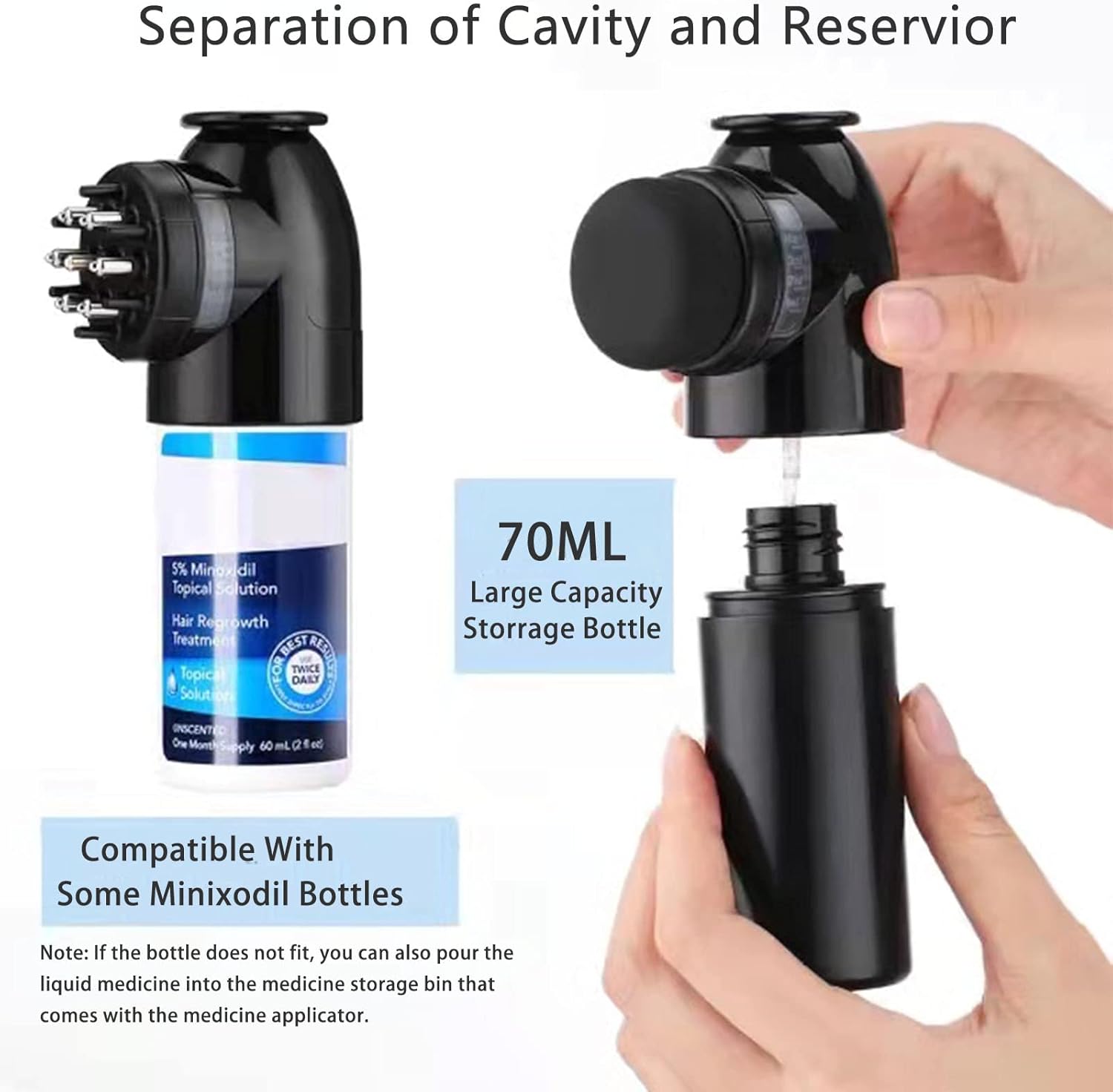 - Flexible Handheld Design: The 70ML large-capacity liquid storage bottle can act as a handle, making it more comfortable to hold and easier to operate. Compatible with some minoxidil bottles. And the liquid tank supports detachable cleaning.