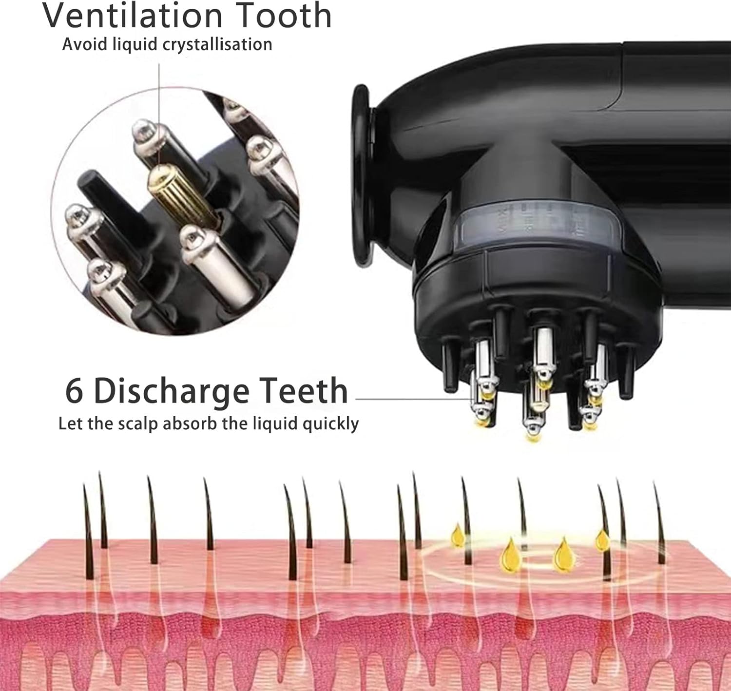 - 6 Discharge Teeth and 1 Ventilation Comb Tooth: Massage the scalp while smearing the liquid evenly, with 1 ventilation tooth avoiding liquid crystallization and the six silicone assisted comb teeth, so that the scalp can absorb the liquid better and more quickly, effectively soothing the scalp.