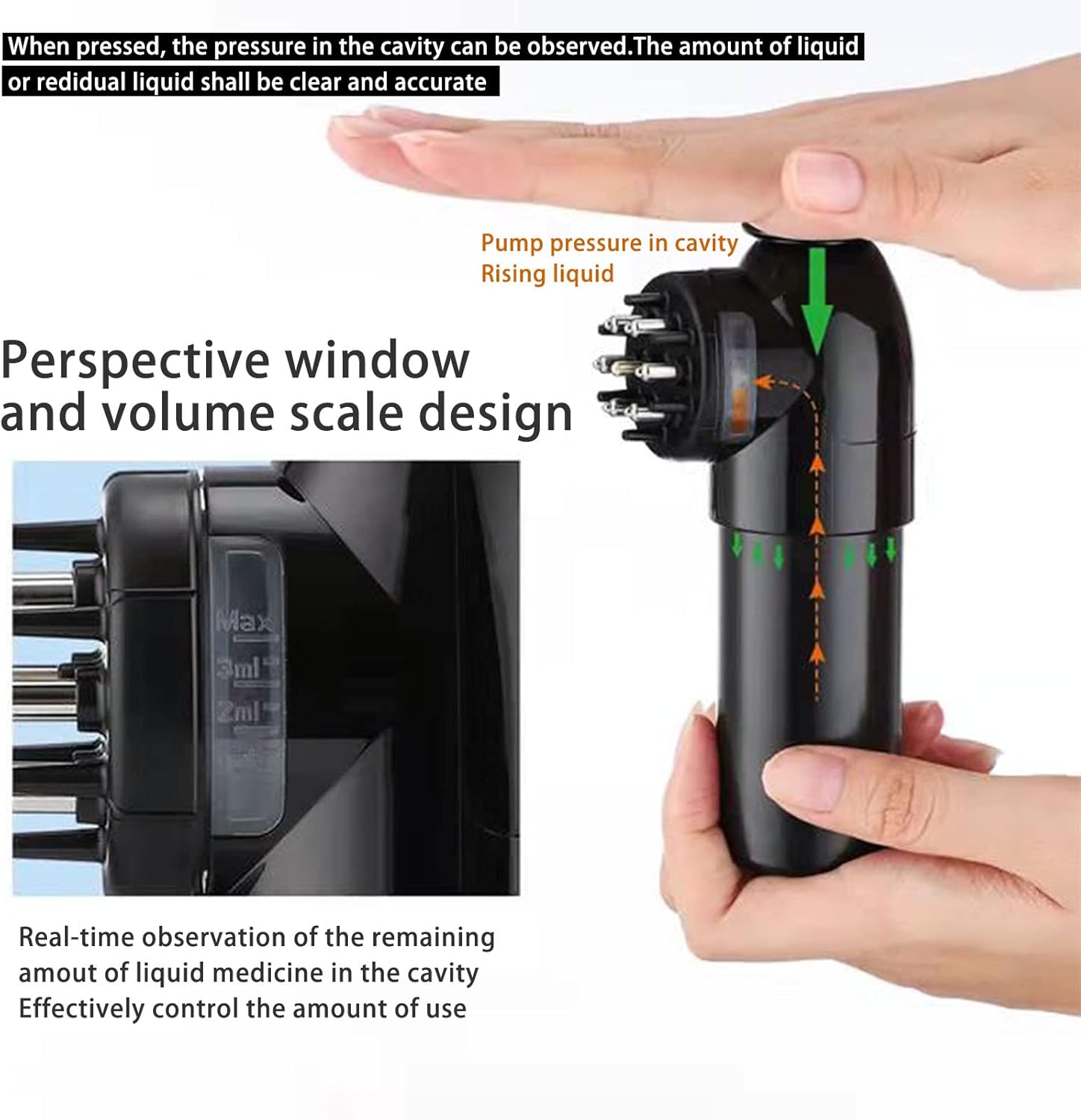 - Separation of Cavity and Reservior: 70 ml liquid storage capacity and 4 ml cavity capacity for liquid to flow out. The cavity is provided with a transparent window and a measuring scale. When pressed on the top of the device, the amount of residual liquid can be seen.