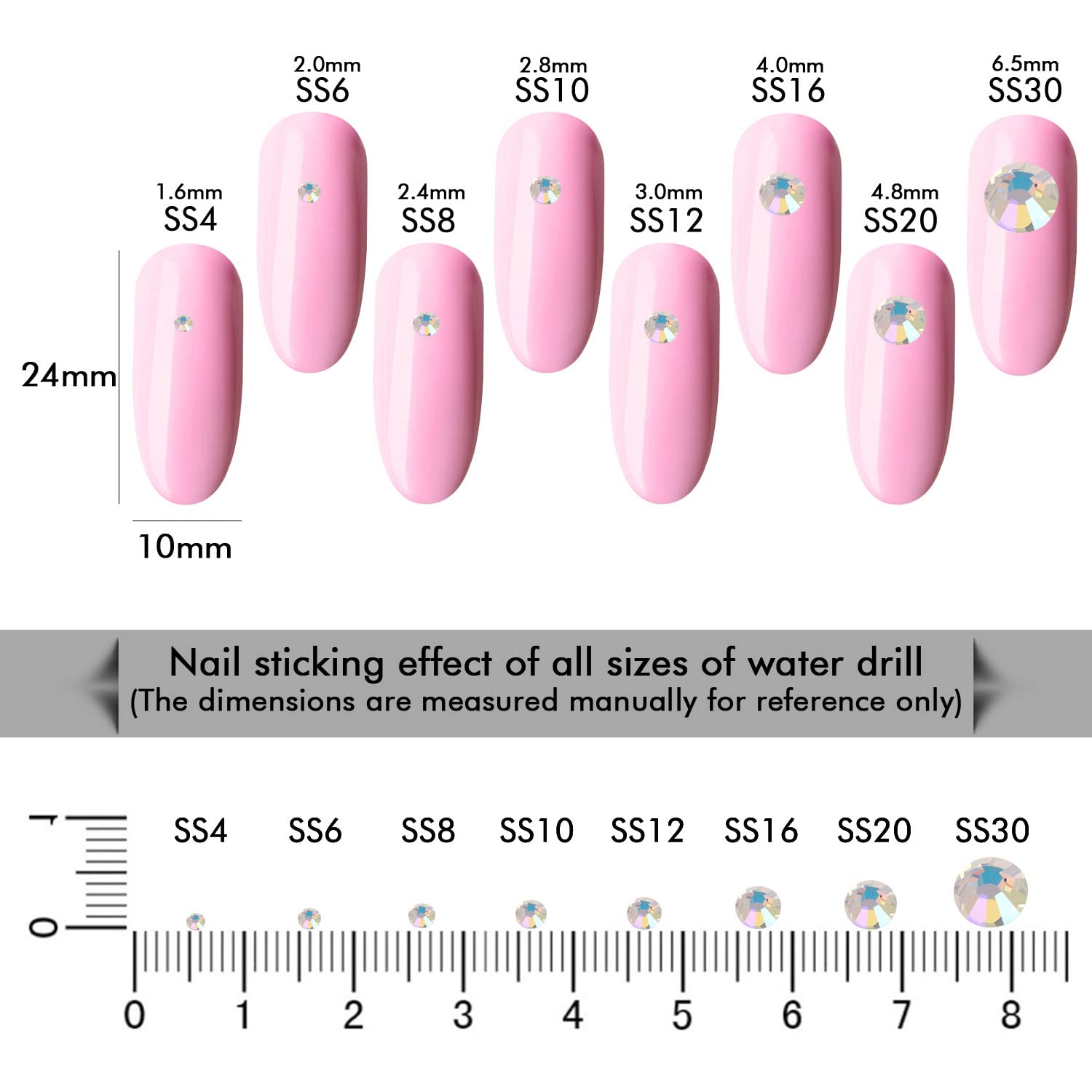 - Different Sizes Available:These rhinestones for crafts come in a wide range of sizes (1.6mm, 2mm, 2.4mm, 2.8mm, 3mm, 4mm, 4.8mm) to suit your different needs