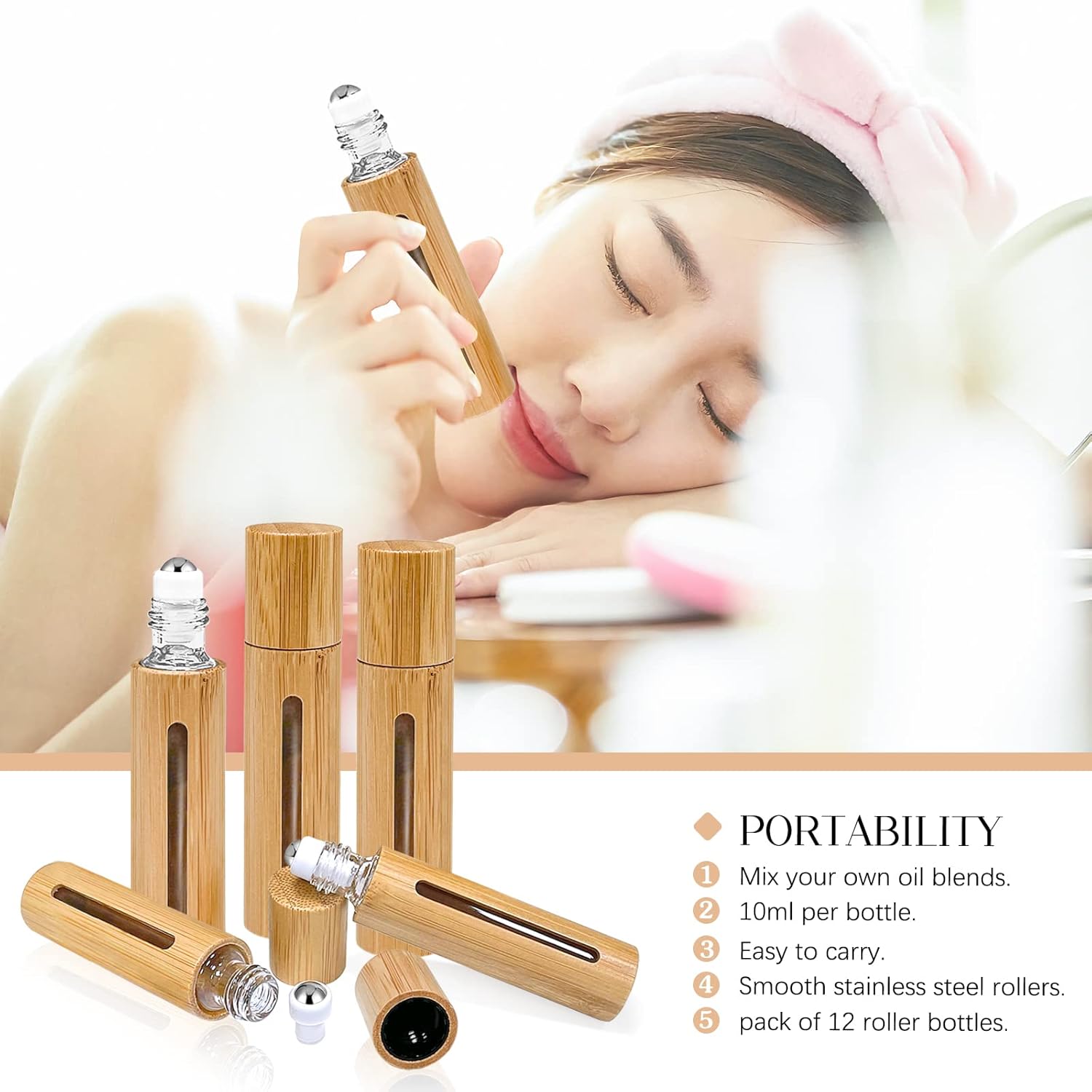 12Pcs 10ml Roller Bottles Balls for Essential Oils, Roll on Bottles with Bamboo Shell Clear Glass Inner, Portable Refillable Perfume Sample Bottle with Stainless Steel Ball