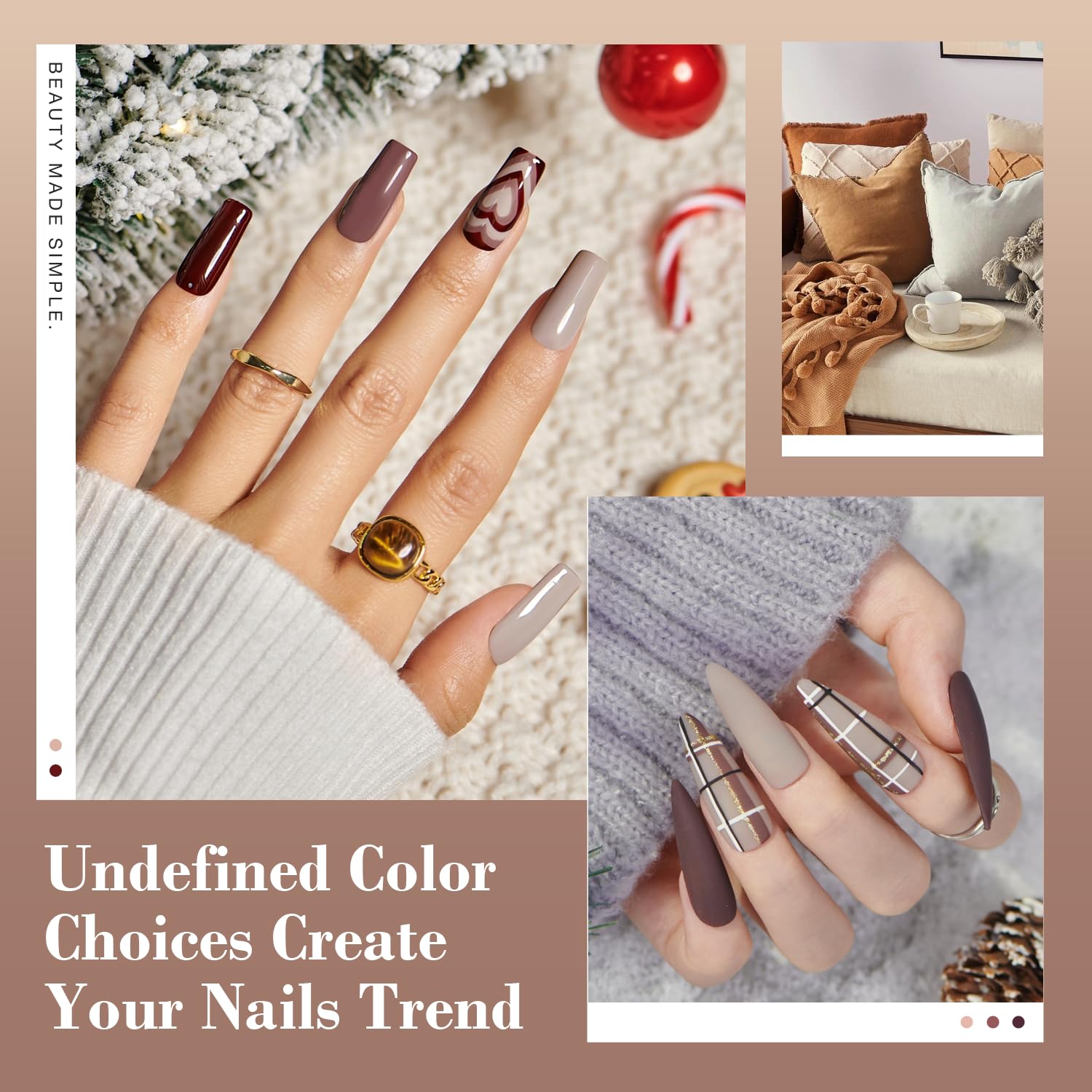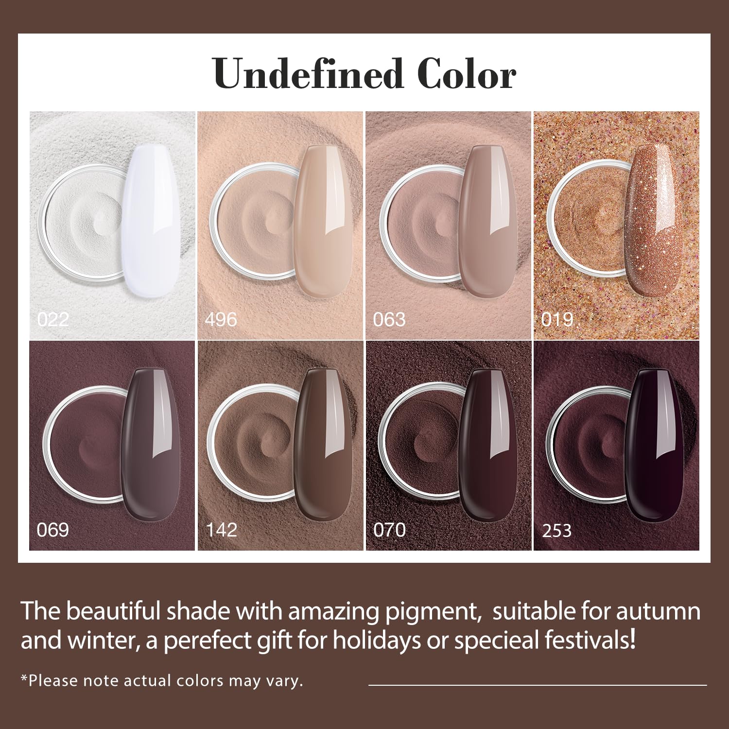- ăUpgraded 30Pcs Starter Kită: AZUREBEAUTY 30 Pcs fall brown nude set dip nails powder starter kit: 8*10g (0.33oz) color powder, 4*10ml dip powder liquid set(base coat/activator/top coat/matte top coat), 2*liquid brush replacement, 1*nail brush,1*nail file, 1*nail polishing block, 1*dip powder recycling tray. What's more, 10*nail sticks and 2*orange wood stickers are added in the kit for color testing as well as ease of use