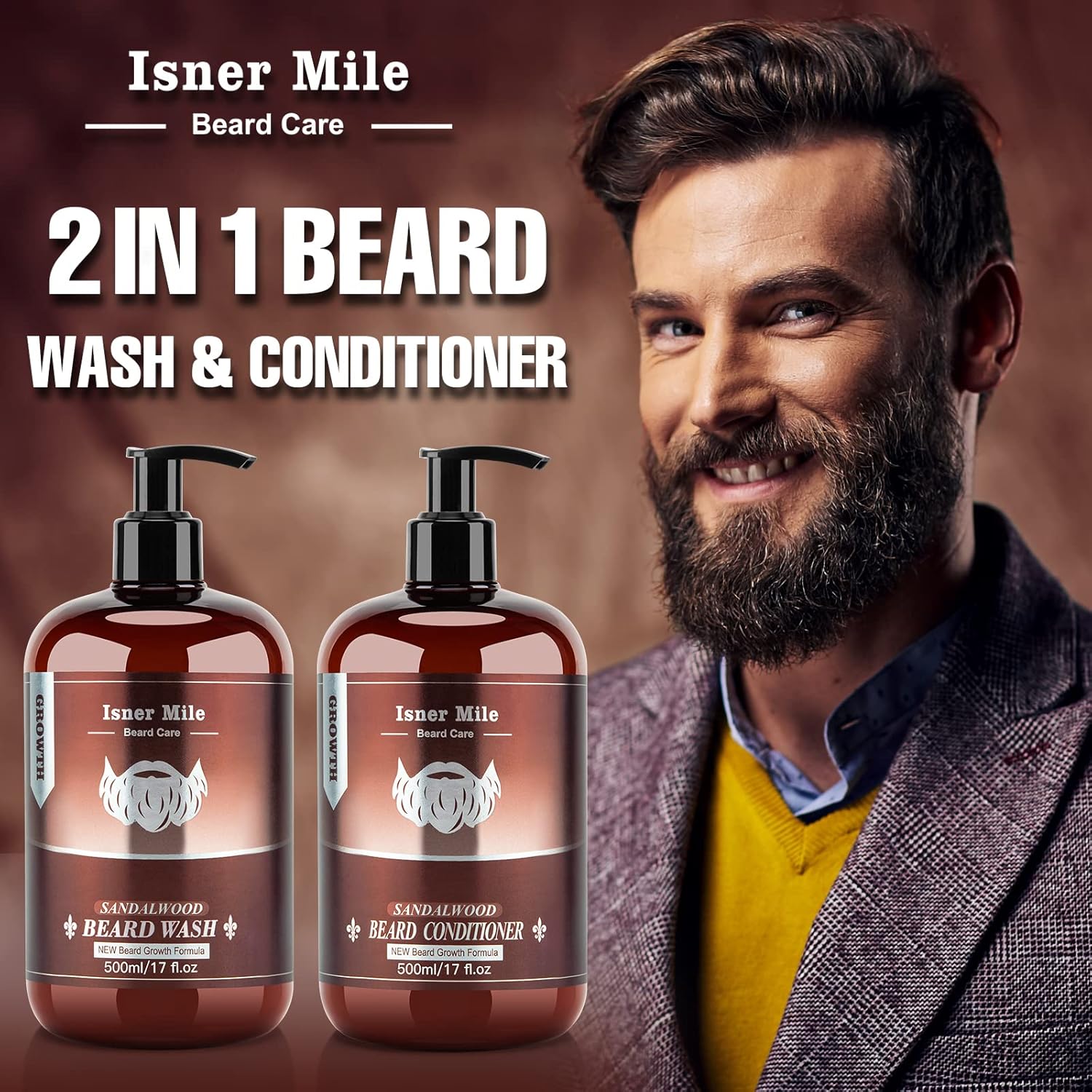 ISNER MILE Beard Wash & Conditioner Set for Men - 17 oz Shampoo with Biotin, Argan & Jojoba Oils for Smooth, Soft, and Strengthened Beard - Sandalwood Scented Grooming Gift