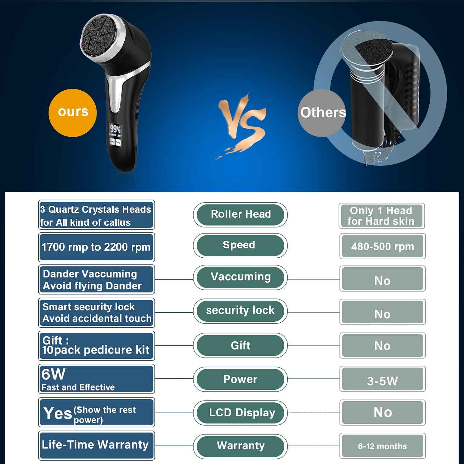 - Pedicure kit with 3 Grinding Head, 2 Speed, with VACUUM ABSORPTION----- 3 Quartz Crystals Removable Roller Heads and 2 Speed Correspond to the roughness required to remove the calluses on the feet. UPGRADE powerful callus remover with dander vacuum cleaner quickly sucks away foot scraps, cle.an and hygienic, and sucks while grinding. dust-free, and foot scraps will not be scattered in air or floor, an essential home pedicure kit for people who has cleanliness.
