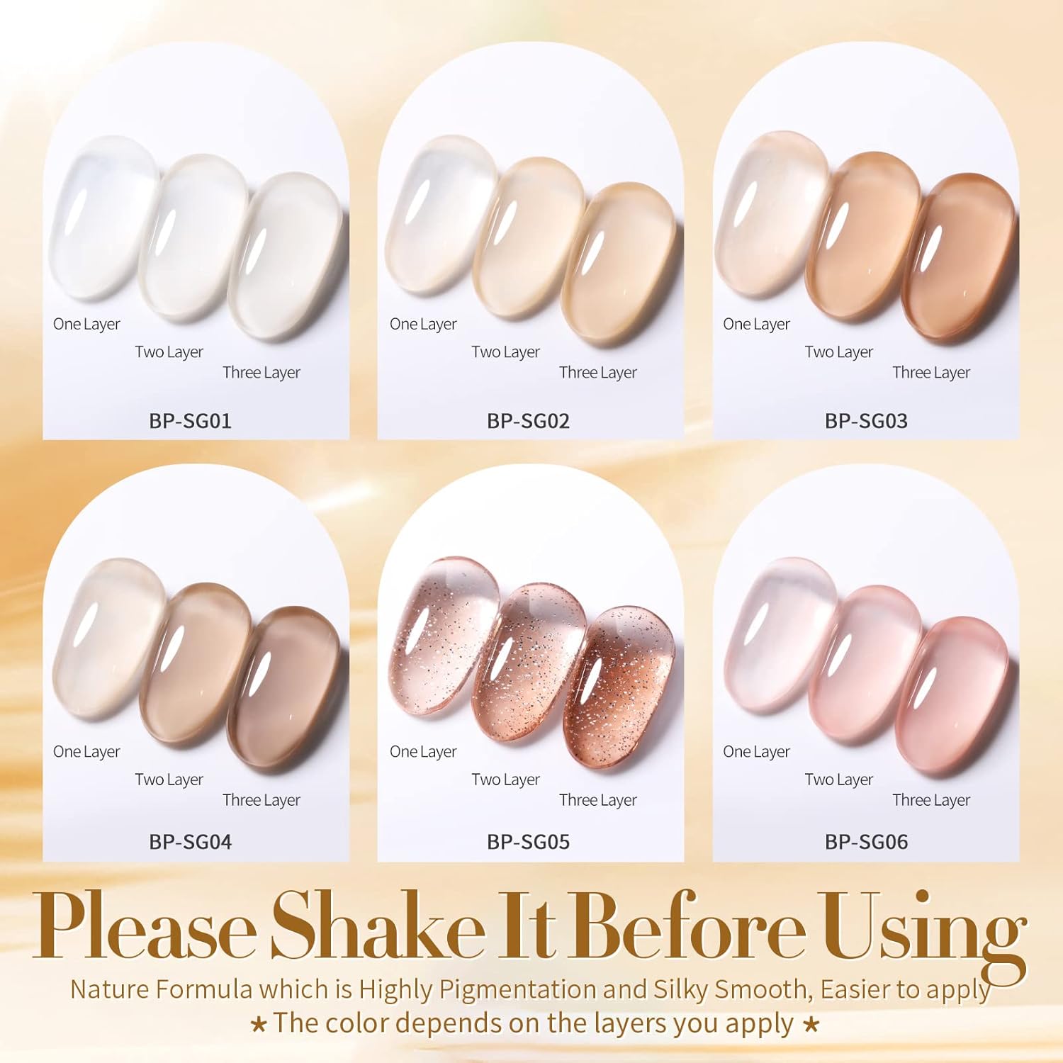 - PACKAGE CONTENTS:6 Bottles BORN PRETTY 7ml jelly nude gel nail polish set.Jelly gel nail polish is a popular nail trend that gives your nails a glassy, see through appearance effect similar to jelly.The jelly nail polish color different from ordinary gel nail polish.It is a semitransparent nail gel. 1 layer, 2 layers and 3 layers are different effect.