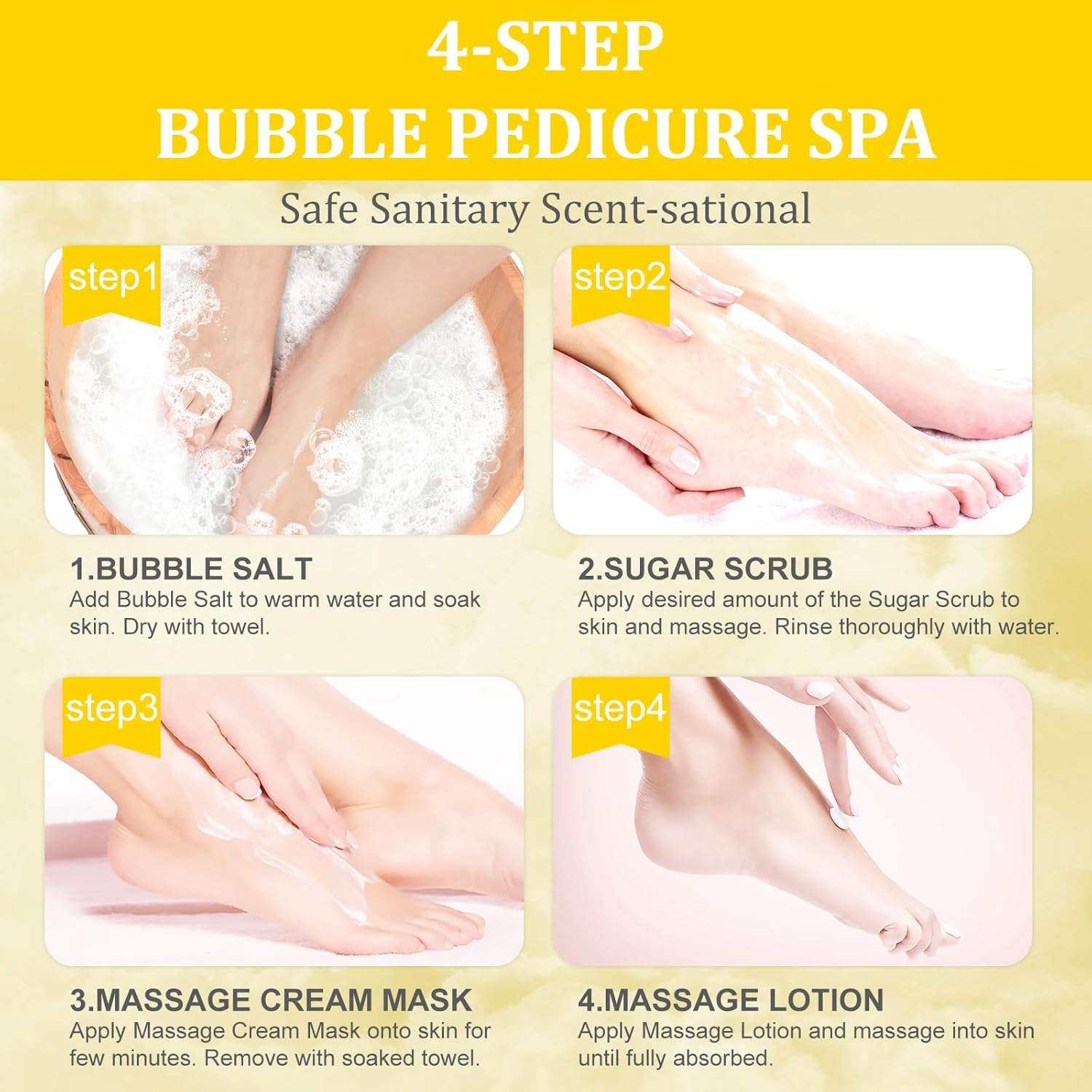 - 🌼[Package Includes]: Exfoliating Foot Spa Pedicure Kit consists of Bubble Salt, Sugar Scrub, Massage Mask, and Massage Lotion for a 4-step foot spa at home. Formated to be gentle on the skin, you are sure to feel your skin feeling soft and supple after use.
