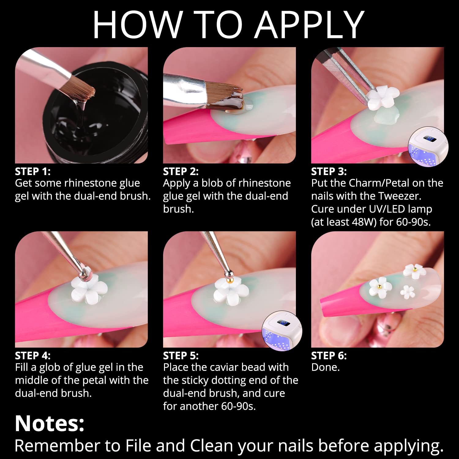- WHAT YOU WILL RECEIVE -- The package contains 2 boxes of ornaments for manicure and 1 pot of 8ml No Wipe rhinestone glue gel with necessary dotting pen and tweezer. The embellishment set includes bling starry AB gems for nails, AB white flatback pearls, metal ball chain, 3D blossom, 3D aurora butterfly / bow / bear / flower, etc.