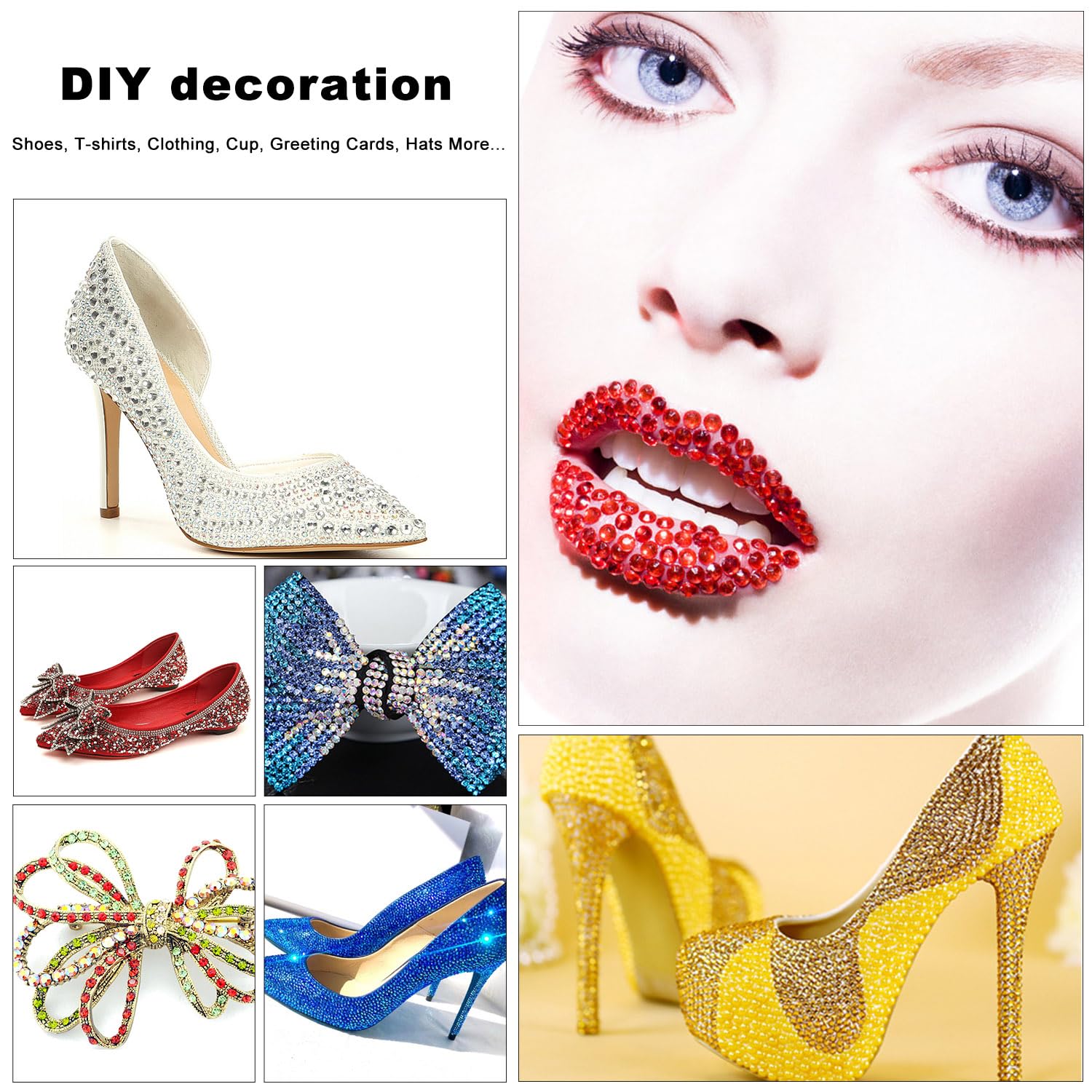 - You can use rhinestones for, Nails, Art, Jewels, Skin, teeth, face, eye, Makeup, tumbler, glass, crafts, cardstock, phone, phone case, plastic, glasses etc. If you are using shoes, clothing, fabric textile type, I suggest you search on Amazon: B09ZQKTW4V
