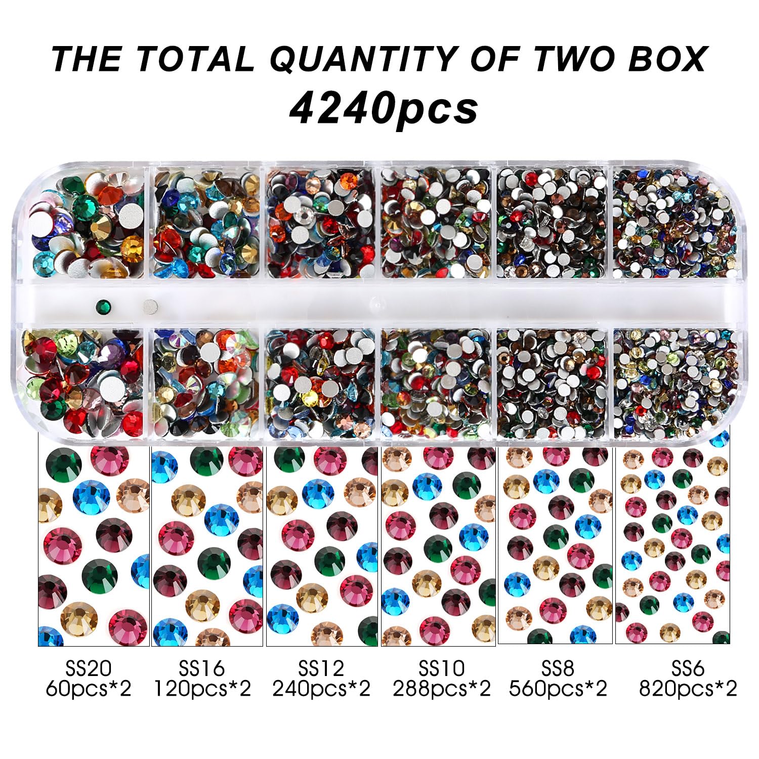 - Product Packaging: Box Packaging SS6 2MM - 1680 Pcs, SS8 2.4MM - 1120 Pcs, SS10 2.8MM - 600 Pcs, SS12 3MM - 480 Pcs, SS16 4MM - 240 Pcs, SS20 4.8MM - 120 Pcs, 1 pcs Tweezers and 1 pcs Picking Pen