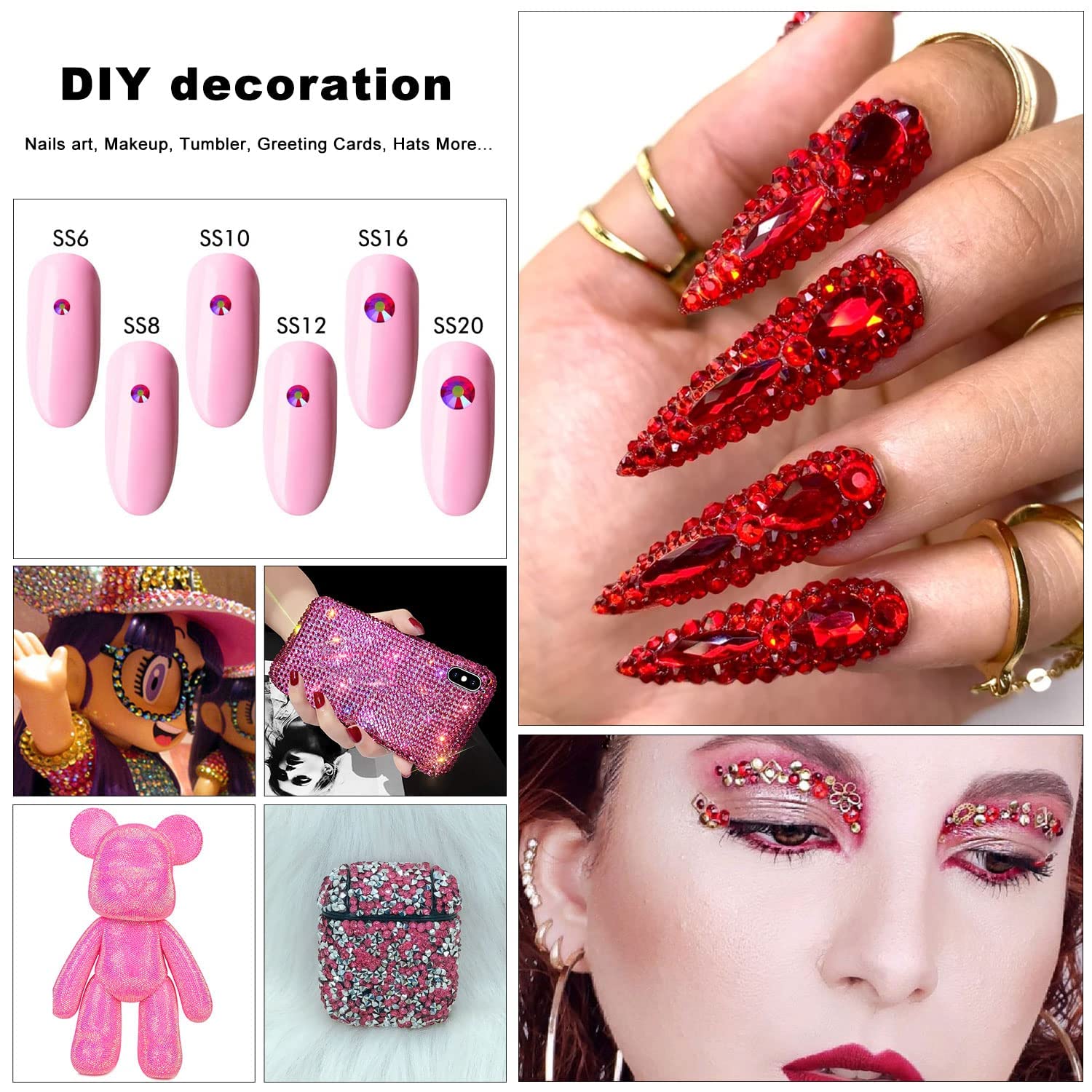 - đUses: You can use rhinestones for nails, art, jewelry, skin, teeth, face, eyes, makeup, glasses, crafts, cardstock, cell phones, phone cases, plastic, glasses, etc.