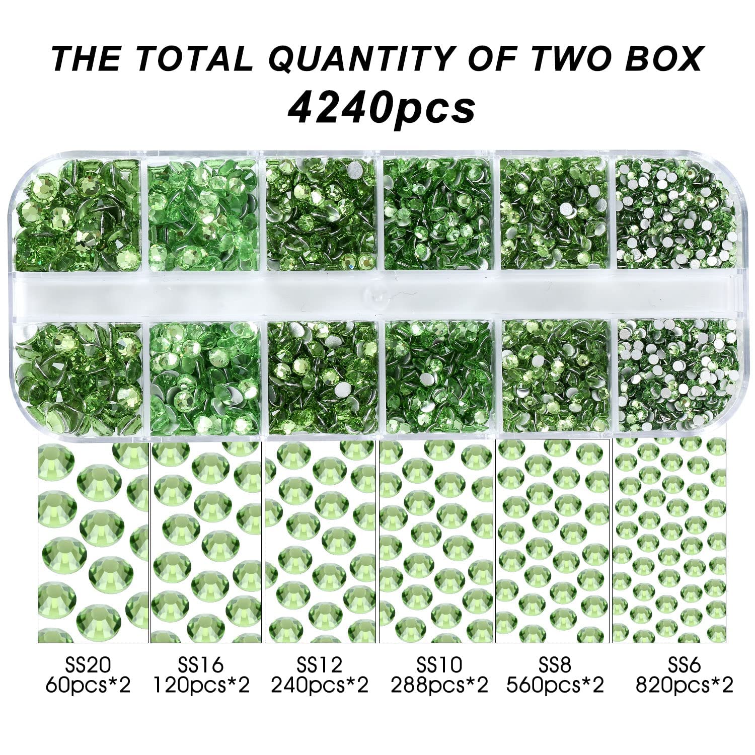 4240Pcs Lt. Green Flatback Rhinestones 6 Sizes Crystal Diamonds for Nail Art Crafts Clothes Shoes with Tweezers and Picking Pen