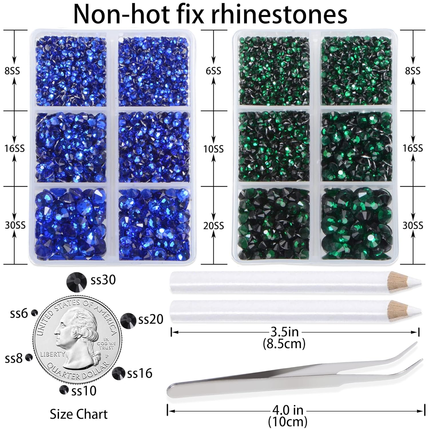 LPBeads 6000 Pieces Emerald and Sapphire Non Hotfix Rhinestones 6 Sizes Round Crystal Glass Flat Back Rhinestones with Tweezers and Picking Pen for Nail Art Crafts Clothes Bags DIY