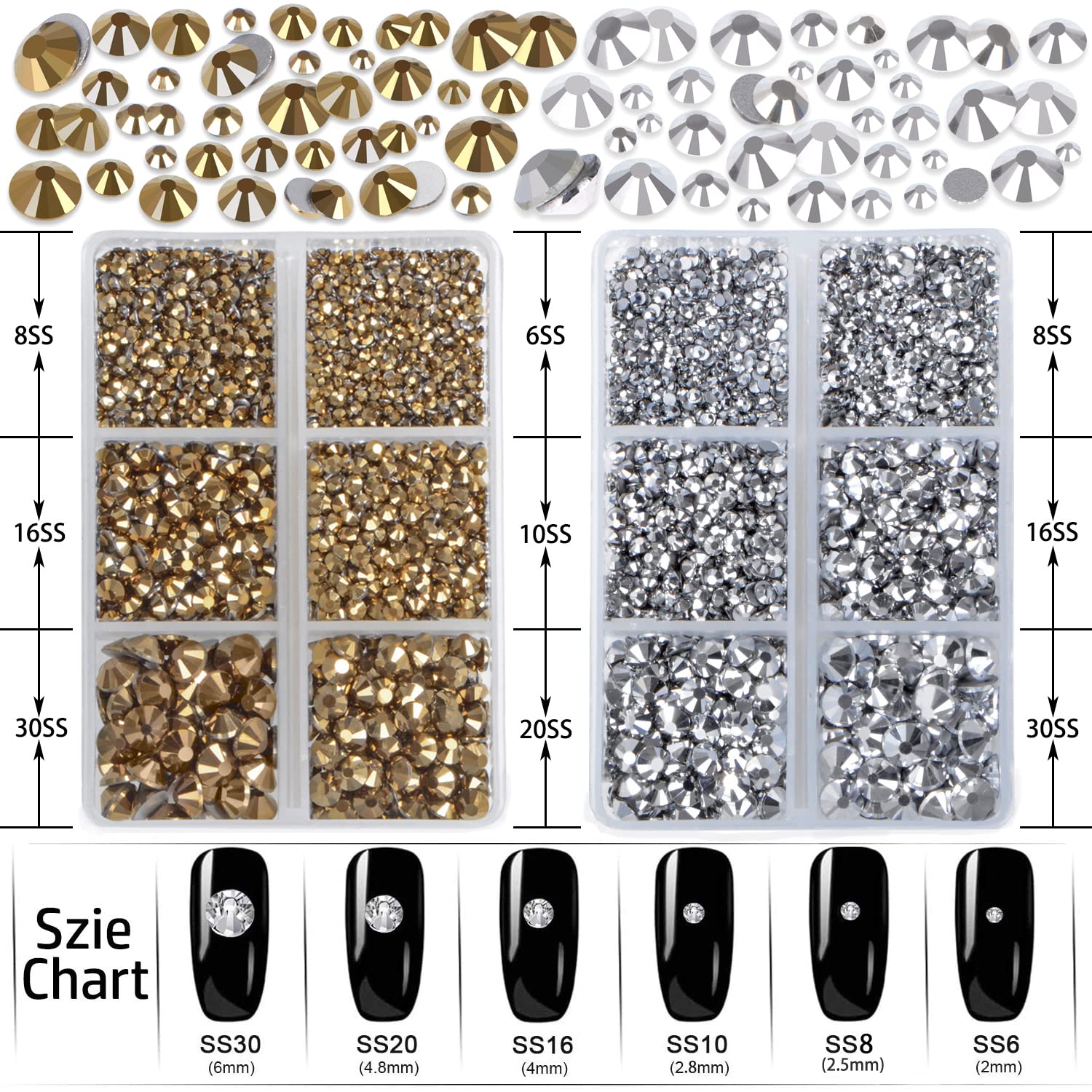 - 6 Sizes charming crystal rhinestones with storage boxes easy to carry, 1.5mm to 6mm. ss6 ss8 ss10 ss16 ss20 and ss30. Rhinestones are not hotfix and require glue to stick them, glue is not included.