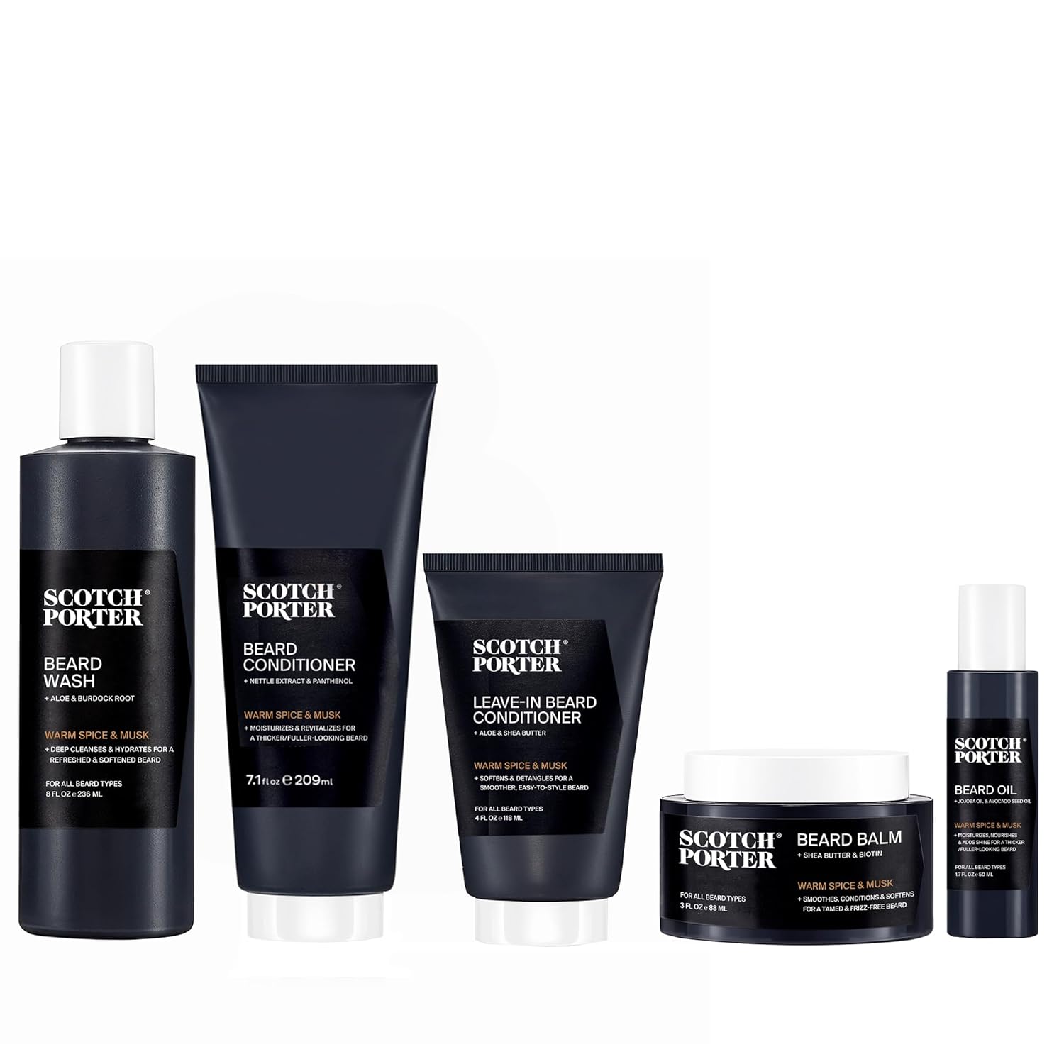 Scotch Porter Superior Beard Collection – Cleanse, Moisturize, Soothe & Style while Encouraging Growth for a Fuller/Healthier-Looking Beard – Includes Wash, 2 Conditioners, Oil & Balm