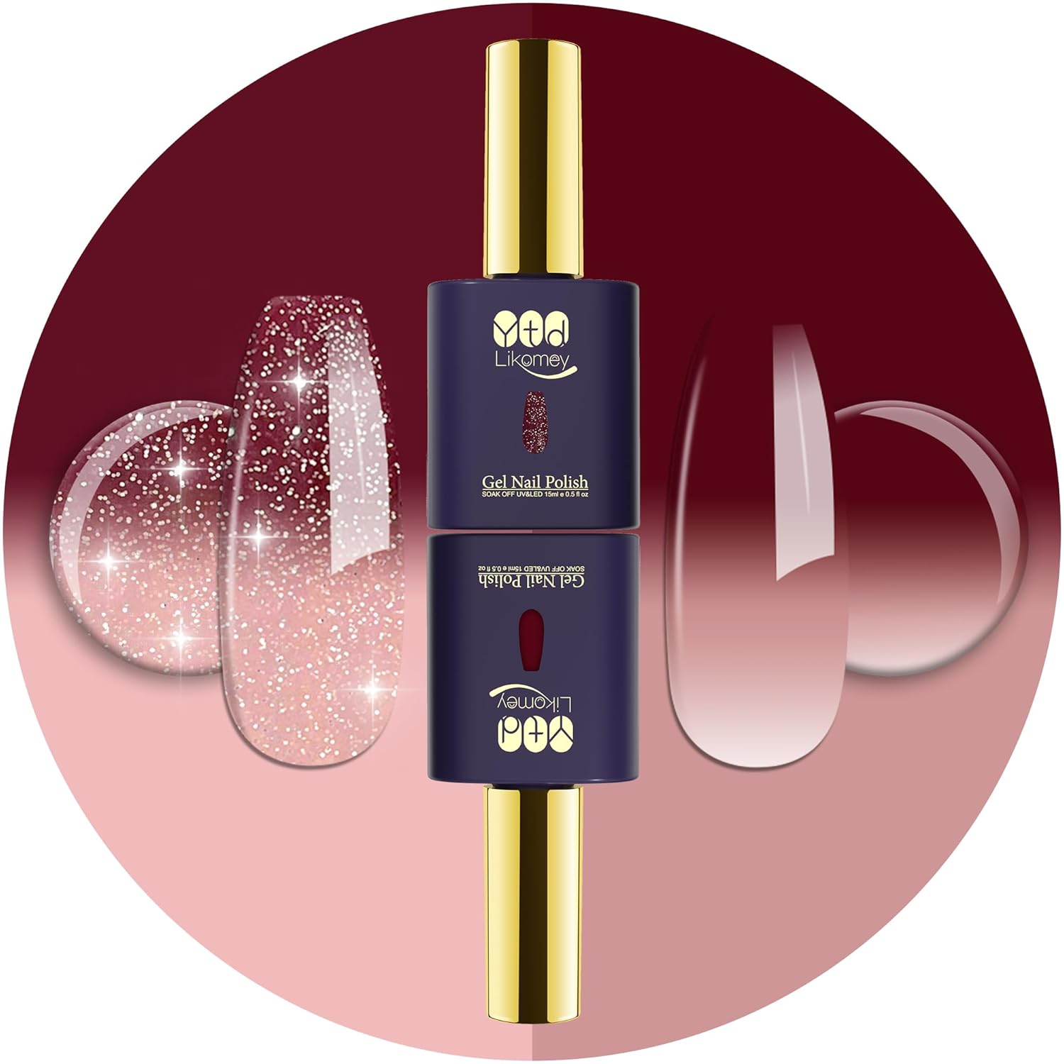 YTD Likomey Gel Nail Polish 2 Pcs Set,15ml Color Changing Nude Pink Burgundy Red and Glitter Nails Gel Kit,Thermal Ombre Change Colors Translucent Salon Manicure Fall Winter UV Color Varnish,0.5 Fl Oz