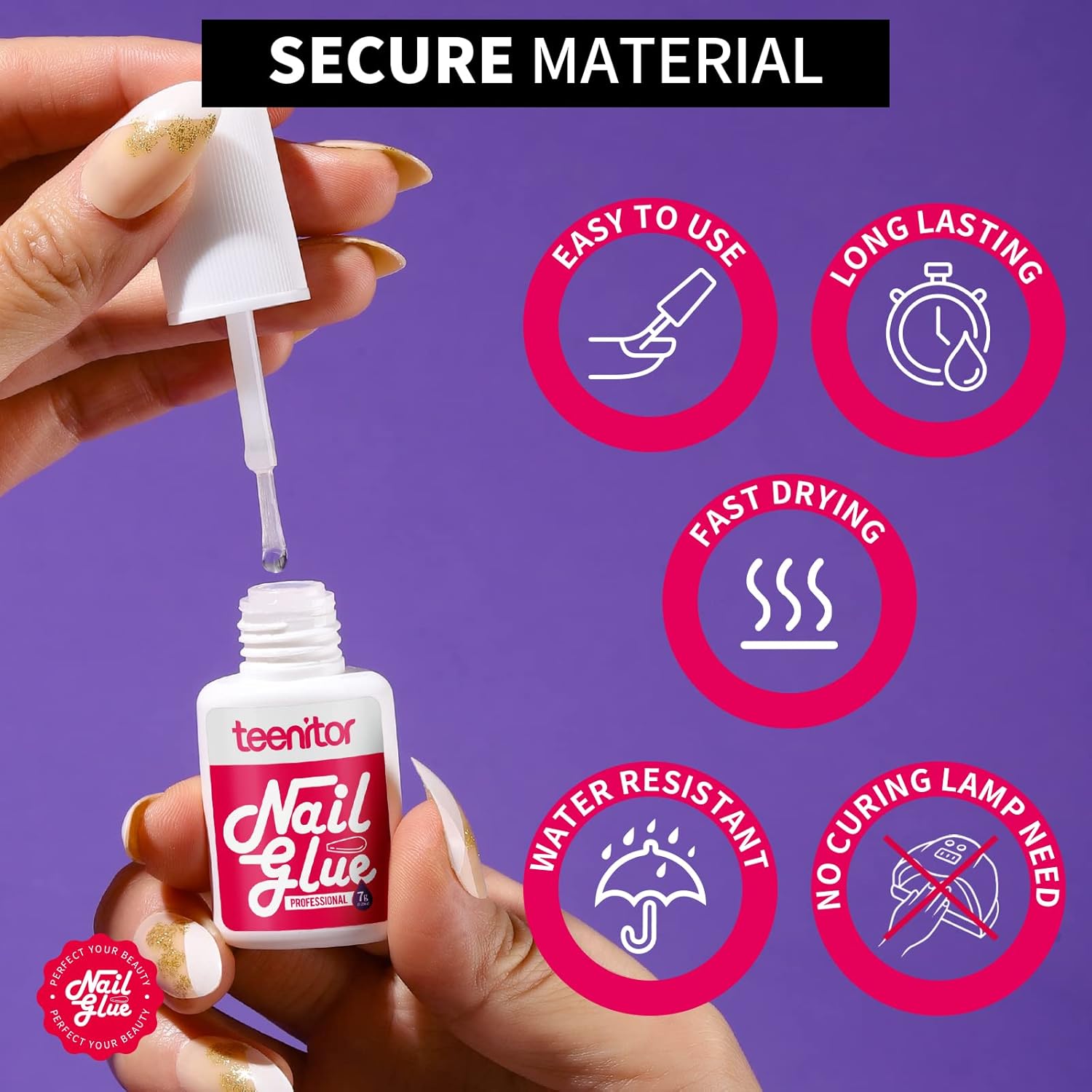 - Super Strong & Dry Quickly: Our Teenitor 7g strong nail glue for press on nails is made of premium quality pink glue which is different from others, strong adhesive allow long lasting to 14-21 days-Easy to Use, Long Lasting , Fast Drying, Water Resistant and No Curing Lamp Need; seal design of bottle will not leak easily and better keep the glue