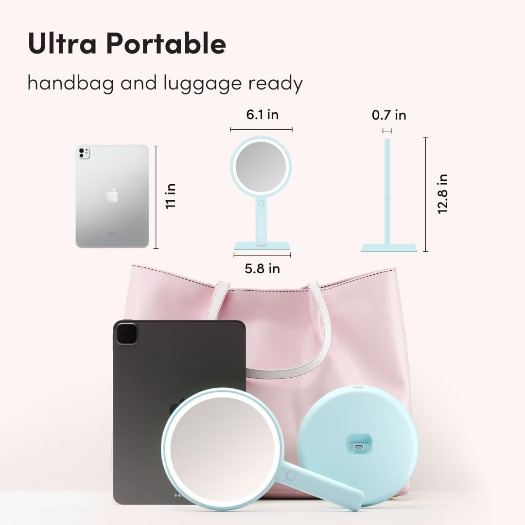 Fancii Cami Handheld Travel Makeup Mirror with Lights, Rechargeable, Extra Large, Double Sided 5X / 1X Magnifying Mirror - 3 Color Lighting, Handheld or Vanity (Blue Fluff)