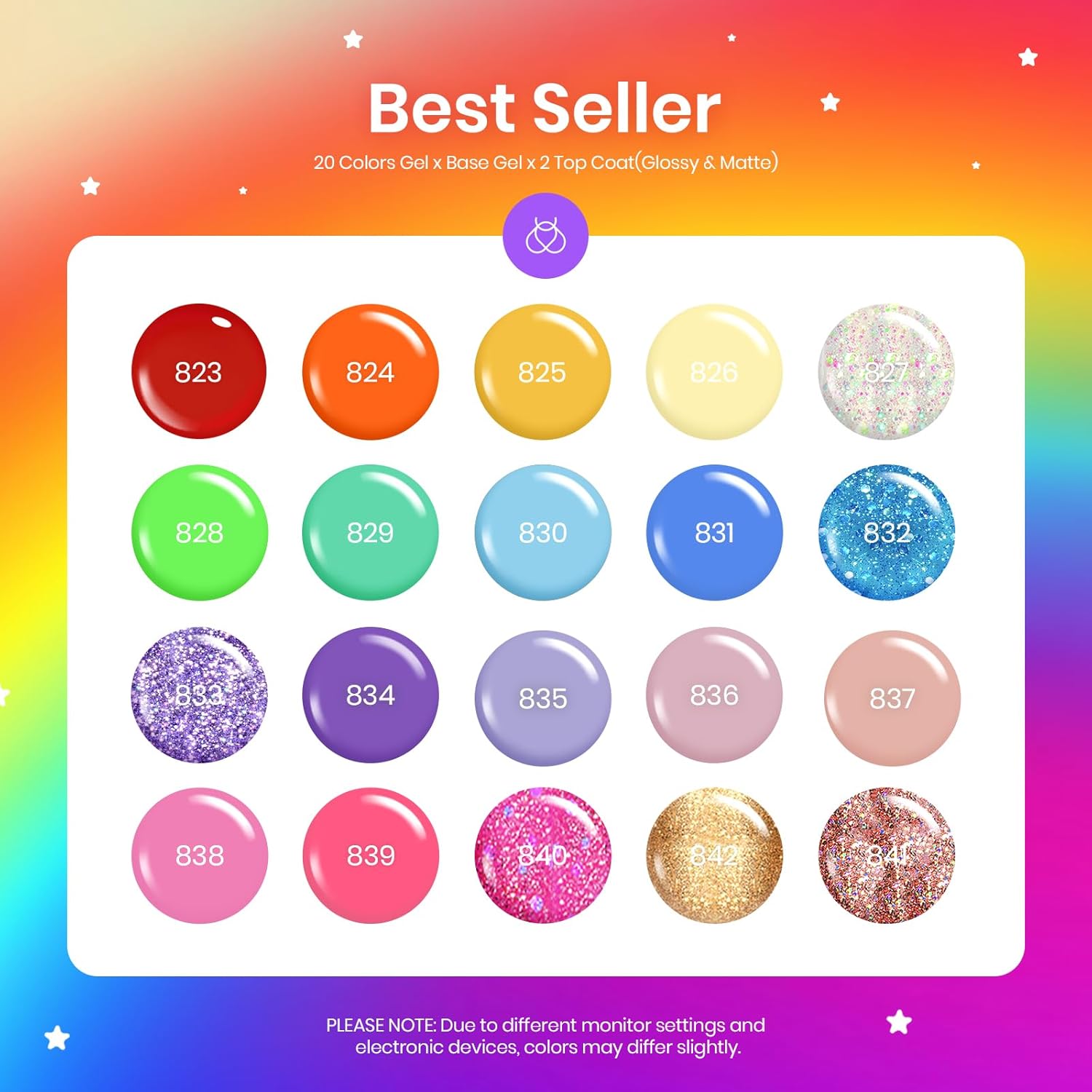 - What You Get: Beetles gel nail polish set with 20pcs color gel (0.17oz/5ml each bottle)+3pcs no wipe base and glossy & matte top coat ( 0.25oz/7.5ml each bottle). 20 colors beautiful shades of popular and trendy colors suitable for all seasons and daily routine life!.Color Number is: BT-823-BT-824-BT-825-BT-826-BT-827-BT-828-BT-829-BT-830-BT-831-BT-832-BT-833-BT-834-BT-835-BT-836-BT-837-BT-838-BT-839-BT-840-BT-841-BT-842.This is perfect for the holidays.