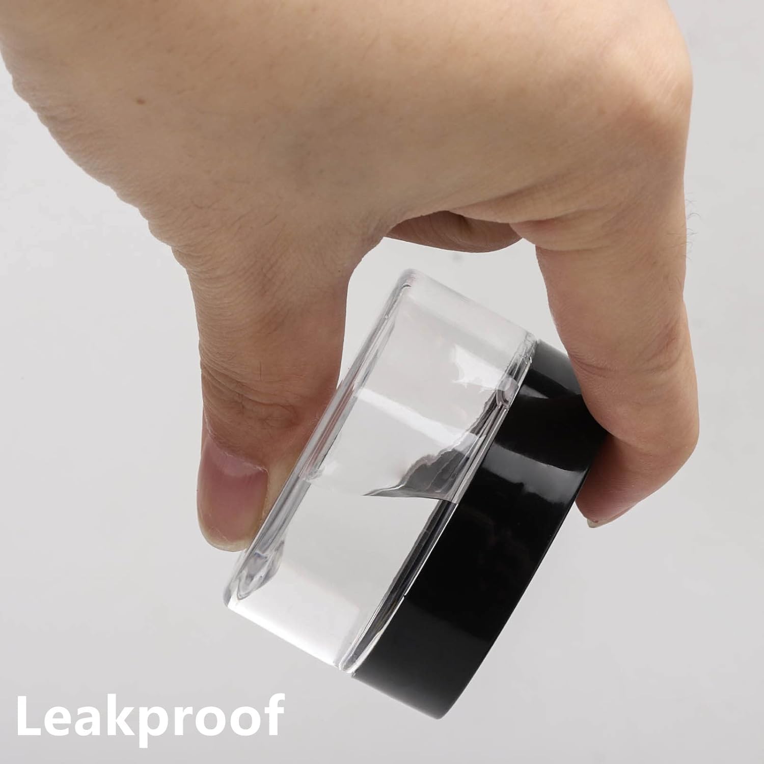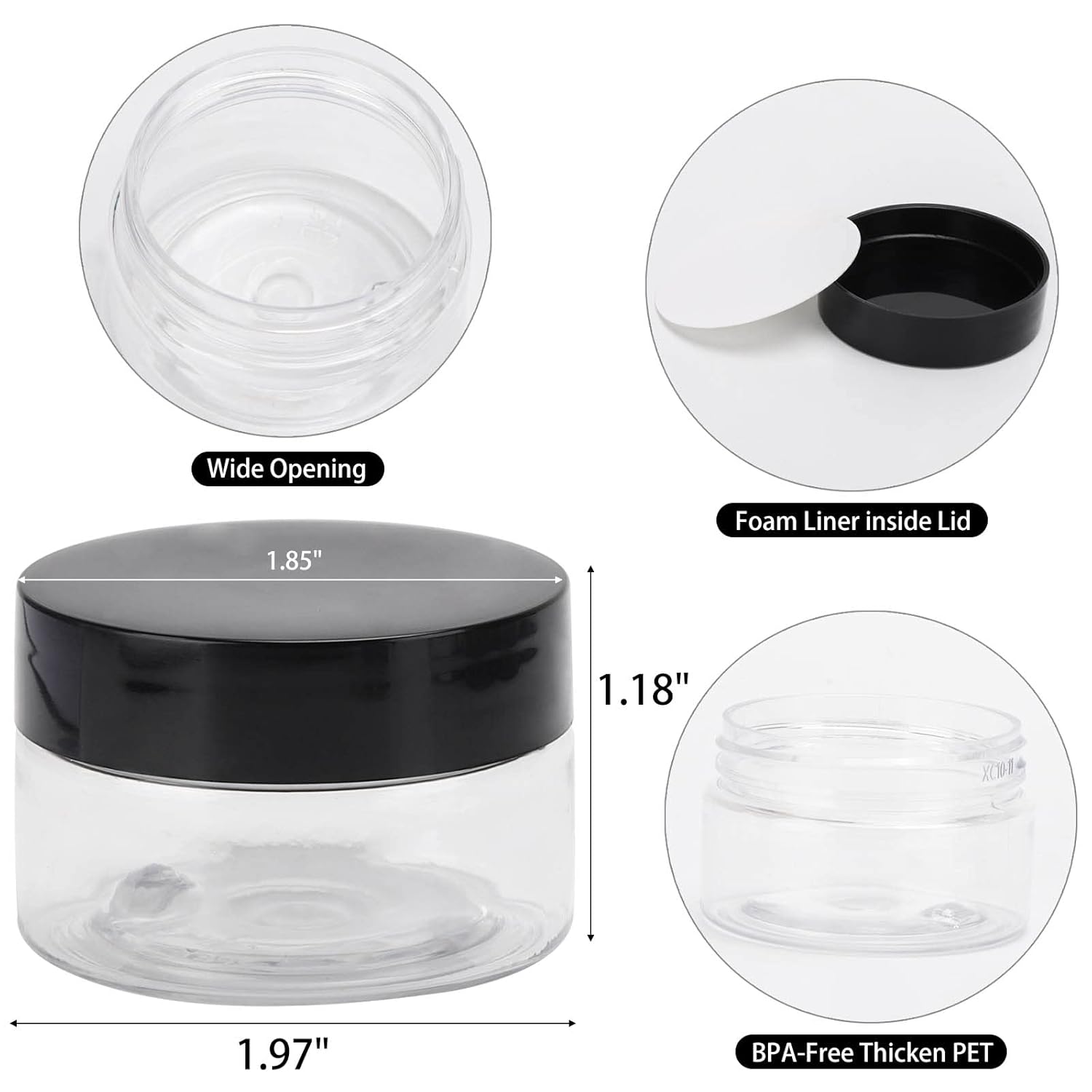 - 50 pieces of refillable cosmetic jars with lid. Capacity:30g/ 1oz . Made of PET plastic, black plastic cover with leak-proof gasket